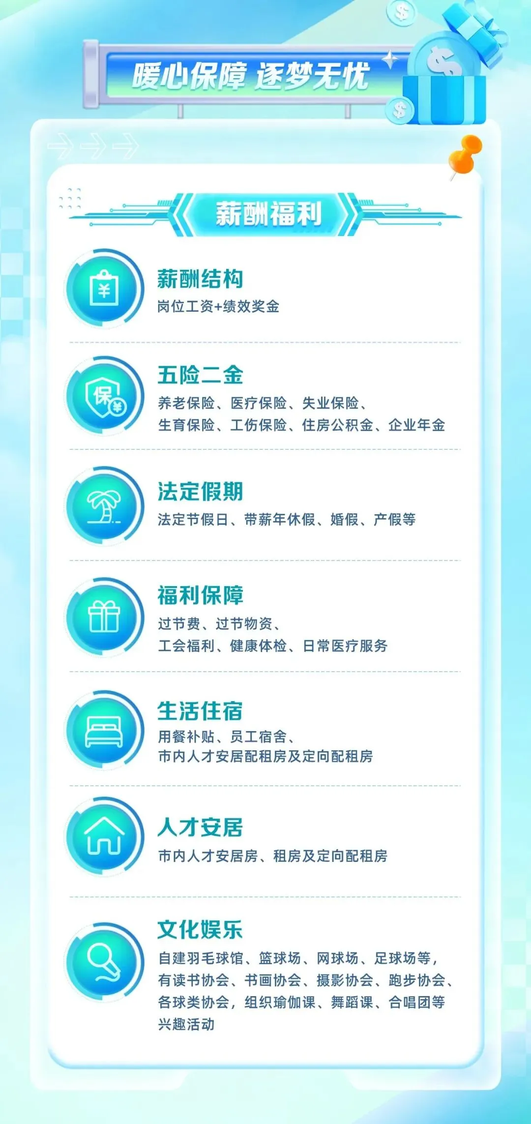 生活支持:提供用餐补贴、员工宿舍、市内人才安居配租房及定向配租房。