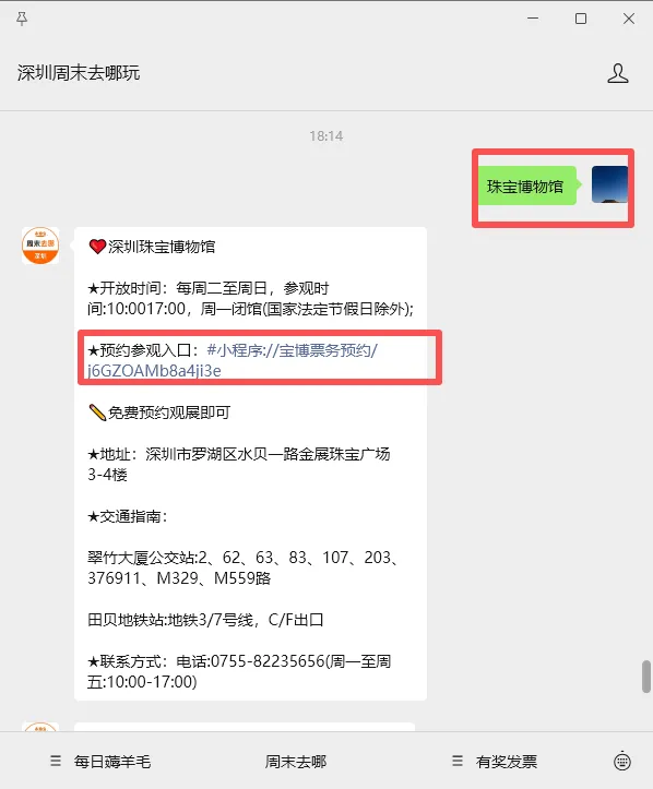 也可以直接扫描下方二维码,跳转【深圳周末去哪玩】公众号或在【本地宝APP】,回复【珠宝博物馆】关键词,即可获取深圳珠宝博物馆预约入口