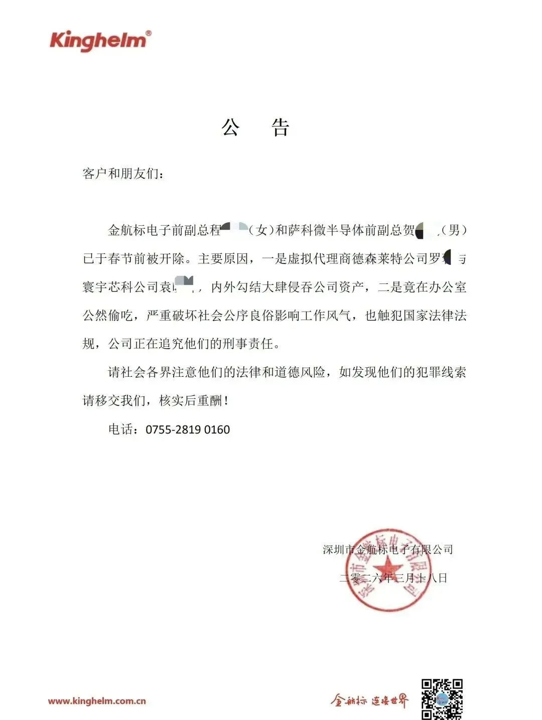公司前副总程某某(女)与萨科微半导体前副总贺某某(男)因严重违纪违法,已于春节前被开除。一是两人勾结虚拟代理商德森莱特罗某、寰宇芯科袁某,内外勾大,肆结侵吞公司资产;二是公然在办公室"偷吃",破坏职场风气并触犯法律;金航标电子(Kinghelm):2007 年成立,国家级高新技术企业,主营北斗 / GPS 天线、射频连接器、工业线束等。