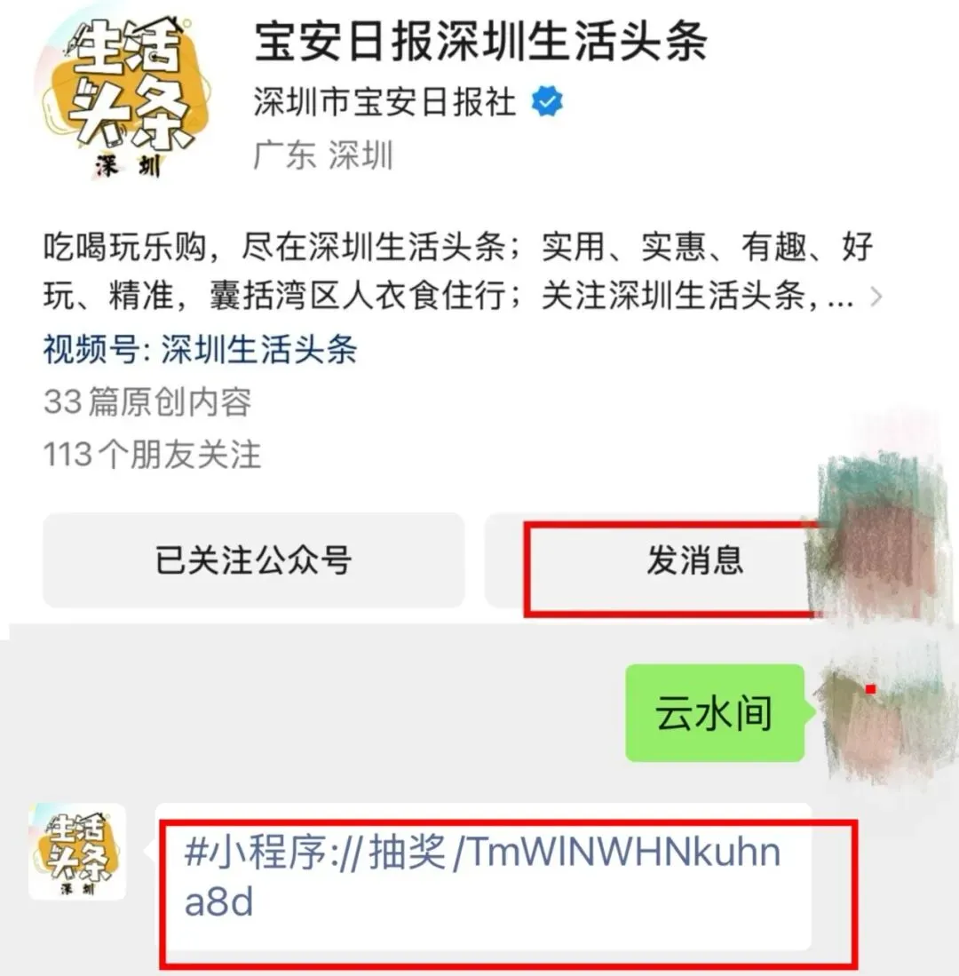 4、在对话框中输入关键词“云水间”获取相应抽奖链接,打开小程序抽奖。