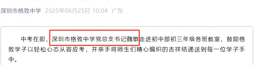 6月25日,深圳市格致中学官微文章显示,魏敏出任深圳市格致中学党总支书记。此前曾任中科附高(深理工附中)副校长,龙华区创新实验学校党总支书记。