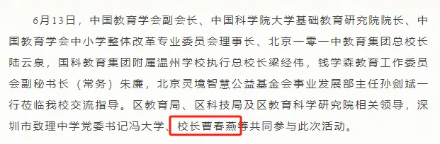 6月13日,据深圳市致理中学官微文章显示,曹春燕已正式出任该校校长。