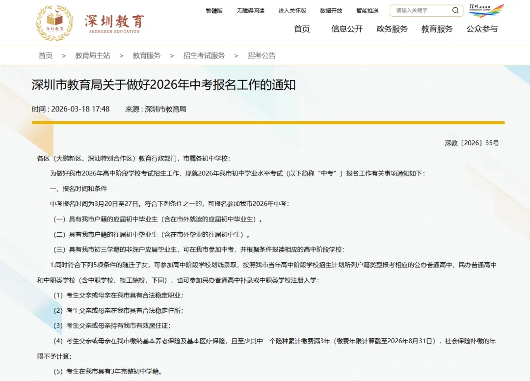 3月18日,深圳市教育局发布了关于做好2026年中考报名工作的通知,深圳市初中学业水平考试(以下简称“中考”)及初二生物与地理学业水平考试(以下简称“初二学考”)报名定于3月20日至27日进行。