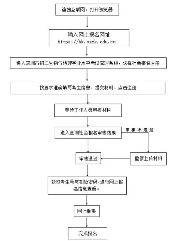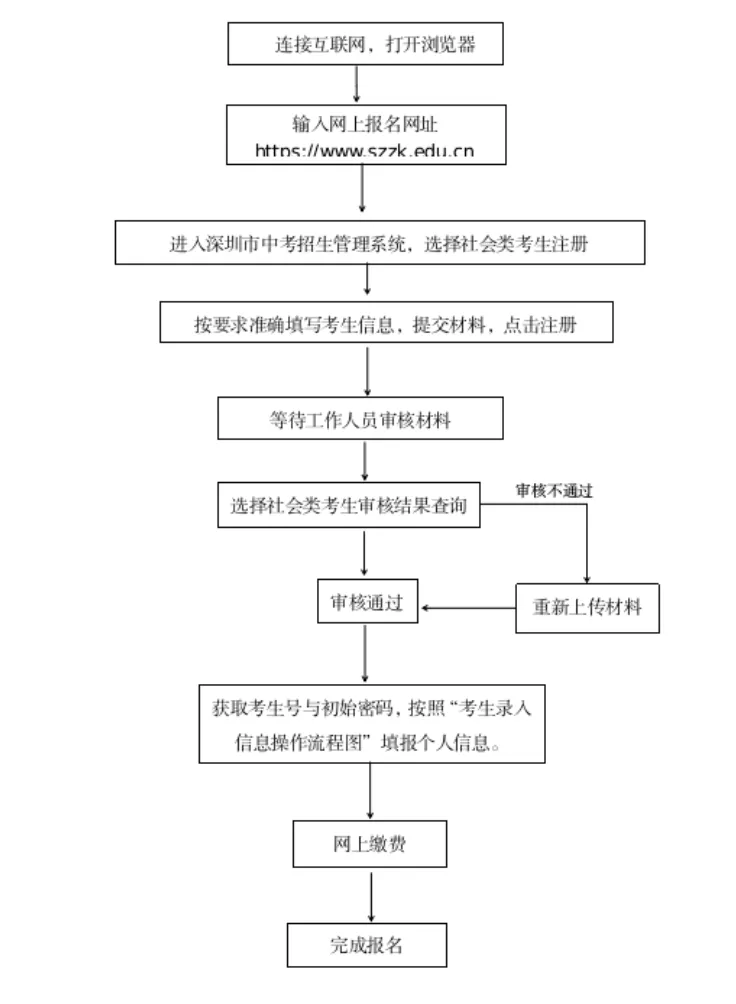 社会类考生采用网上报名方式进行报名(具体操作可对应参照“社会类考生中考报名流程图”“社会类考生初二学考报名流程图”)。报名考生须在规定时间登录报名网址,按照提示进行网上注册,上传报名审核资料,由考生户籍所在区社会报名点进行线上审核,审核通过后系统将生成考生号及初始密码。中考考生须用获取的考生号及密码登录中考报名系统,填写个人信息,具体操作可参考“中考考生录入信息操作流程图”。初二学考考生须用获取的考生号及密码登录初二学考管理系统,核对个人信息。