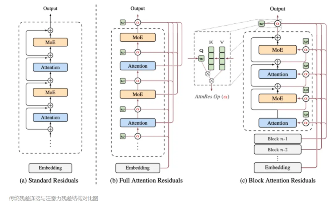 Kimi团队提出的“注意力残差”(Attention Residuals)机制,则是对这一底层逻辑的重构。它不再让每一层无差别地接收所有历史信息,而是引入了一个“智能筛选器”,让当前层按需选择最值得参考的内容进行聚合 。如果说传统方式是“搬运整座图书馆”,那么“注意力残差”就是“只带走最关键的几页参考文献”。