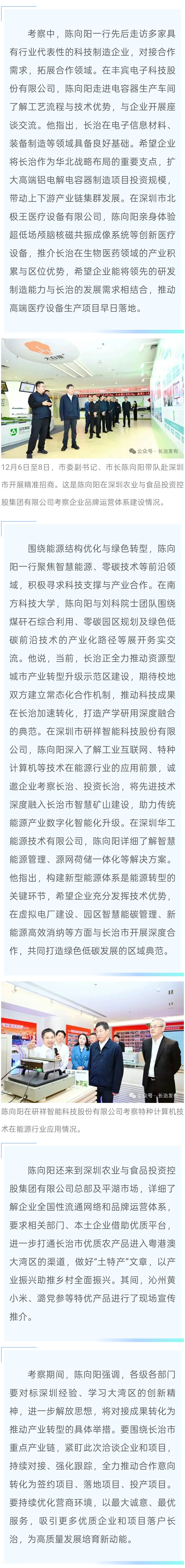 12月6日至8日,长治市委副书记、市长陈向阳带队赴深圳市,聚焦高端制造、能源转型、智慧医疗、现代农业等重点领域,开展精准招商对接,学习先进经验,积极链接湾区资源,全力推动一批高质量产业项目落户长治,为长治市高质量发展注入强劲动力。市政府秘书长桑利刚参加。