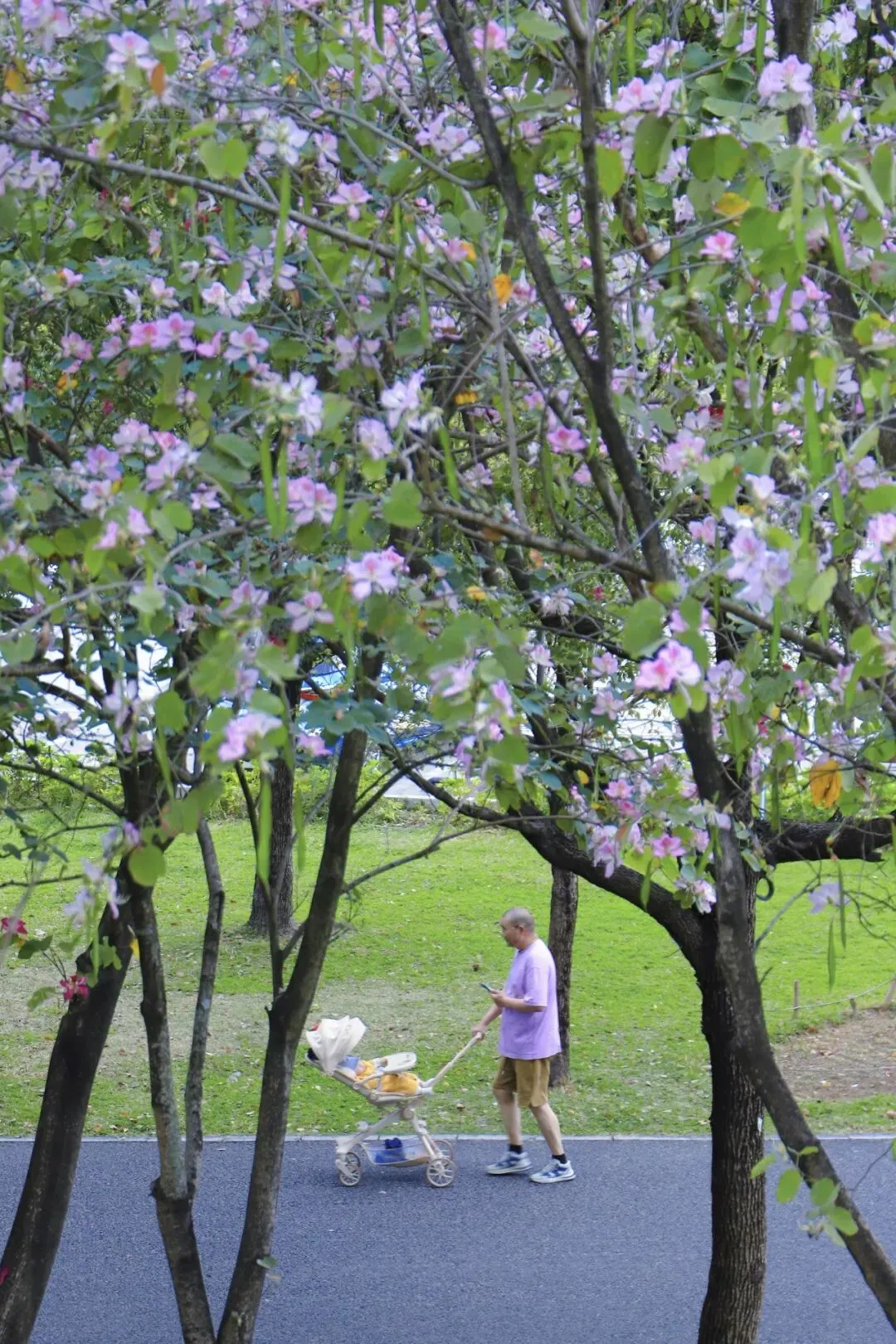抬头望去,漫天的宫粉紫荆开得盛大而随性。它们不像园林景观那样刻意堆砌,倒更像是大自然在城市上空洒下了一场经久不散的粉色烟雾。