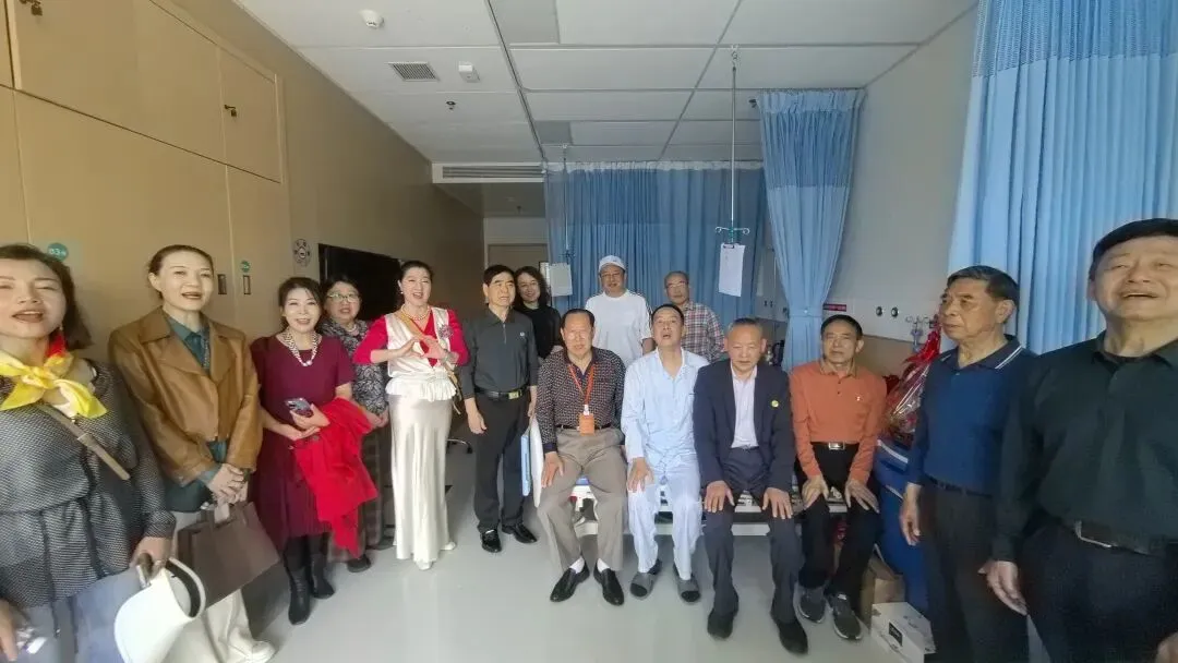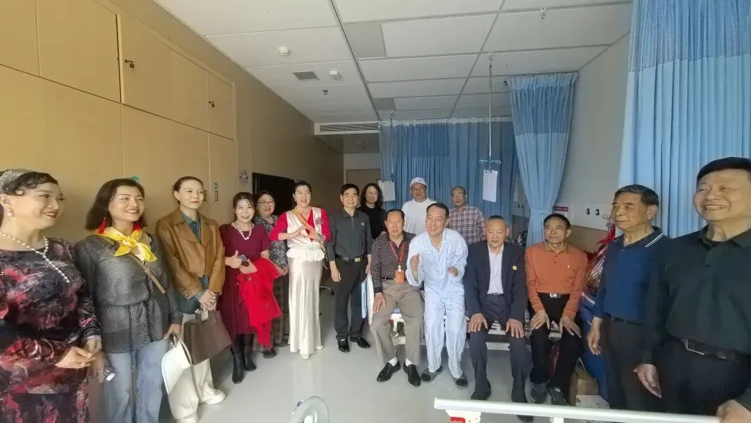 参与此次慰问的同仁,皆是文华音乐中心的核心力量:理事长刘代禄亲自带队,彰显着对同仁的重视与关怀,他动情说道:“这是我们中心的光荣传统,谁家有事都要去帮忙,同仁生病了去医院或家里慰问一下,形成一种制度,人人都献出一点爱,让世界变得更美好!”高级顾问何林、张淦荣,秘书长伍小兰,副秘书长吴孟国、黄有良,监事莫成勇,理事赵忠、丁俊霞、卢艳、吴祝清、李冰组成的管理团队,并肩前行,传递着团队的凝聚力;手风琴老师刘智、林清华夫妇,带着艺术工作者的温柔与热忱,送上诚挚祝福;老兵代表张强、袁道友,秉持着军人的赤诚与担当,诉说着并肩同行的深厚情谊。大家围在周麒麟副理事长身边,与他亲切交谈,细细询问他的病情、治疗情况和身体感受,反复叮嘱他一定要安心养病、积极配合治疗,放下顾虑,早日康复,回归文华这个温暖的大家庭。在病床前,全体慰问人员为周老师清唱了《爱的奉献》,悠扬的歌声里满是牵挂与祝福,驱散了病房里的沉闷,也让这份温暖更加动人。病房内,暖意融融、温情涌动。没有过多华丽的言辞,每一句都饱含关切;没有盛大的仪式,每一个细节都充满心意。在此,特别感谢杨雨竹主任——深圳市中医肛肠医院(福田)护理部主任,一直以来对周副理事长的细心照料,也衷心感谢杨主任对音乐中心一行到来的盛情款待,这份贴心关怀让整个慰问过程更添暖意。周麒麟副理事长看着前来探望的同仁们,脸上露出了欣慰的笑容,他衷心感谢中心的关怀与同仁们的牵挂,坚定表示一定会好好养病,不辜负大家的期待,早日康复回归,与大家并肩携手,继续为深圳市文华音乐中心的发展贡献力量。