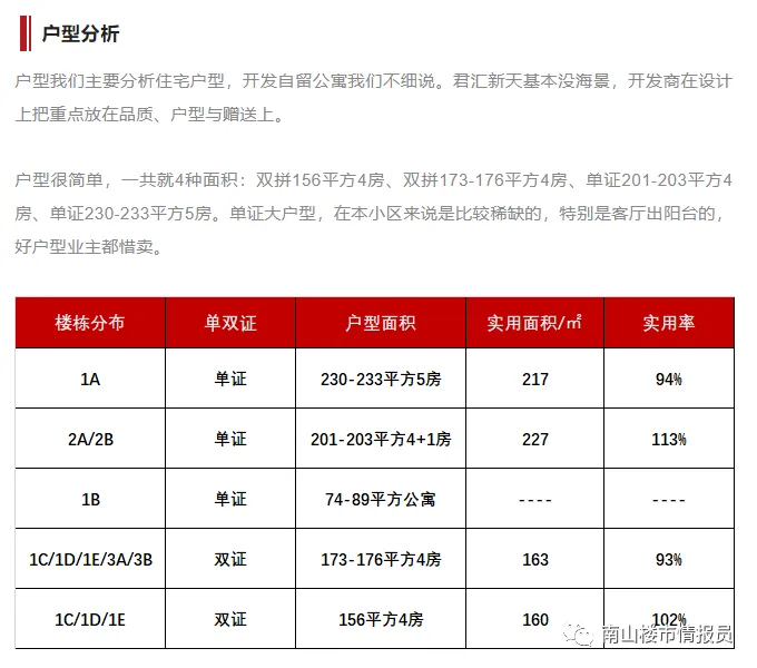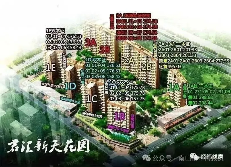小区呈南北两排分布,一共7栋。其中1B栋为公寓,2梯6户,部分89平方朝东南户型开发商自留。单证只有1A/2A/2B栋,1C/1D/1E/3A/3B栋为双证。可以看出双拼占比较高,达78%。从面积上看,属于大户型社区,都是150平方以上的大面积单证在200平方以上,一半都是板楼,居住舒适,每户均有赠送,不同户型赠送面积在30-60平方左右。