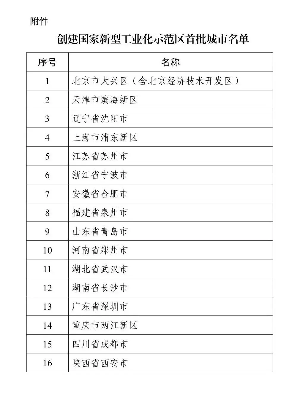 贯彻落实党中央、国务院关于加快推进新型工业化的战略部署,按照《评比表彰和创建示范活动管理办法》有关要求,经党和国家功勋荣誉表彰工作委员会办公室批准,工业和信息化部组织开展国家新型工业化示范区创建活动。依据《国家新型工业化示范区创建活动工作方案》,经省级人民政府推荐、资料审核、专家评审等程序,确定首批16个创建国家新型工业化示范区城市(以下简称创建城市),现将名单予以公布(见附件)。