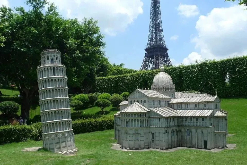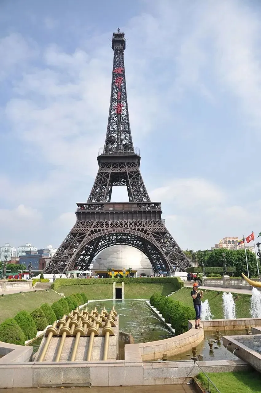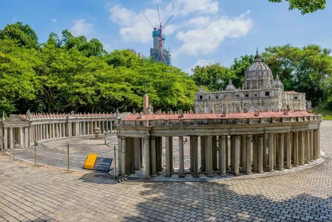 深圳世界之窗其中包括世界著名景观埃及金字塔、阿蒙神庙、柬埔寨吴哥窟、美国大峡谷、巴黎雄狮凯旋门、梵蒂冈圣彼得大教堂、印度泰姬陵、澳大利亚悉尼歌剧院、意大利比萨斜塔等等。这些景点分别以1:1、1:5、1:15等不同比例仿建精致绝伦惟妙惟肖。有些景点气势非常壮观。如缩小为三分之一比例的法国埃菲尔铁塔高108米巍然耸立,游人可乘观光电梯到塔顶饱览深圳市和香港风光。缩小的尼亚加拉大瀑布面宽有八十多米落差十多米水流飞泻吼声震天声势浩大。