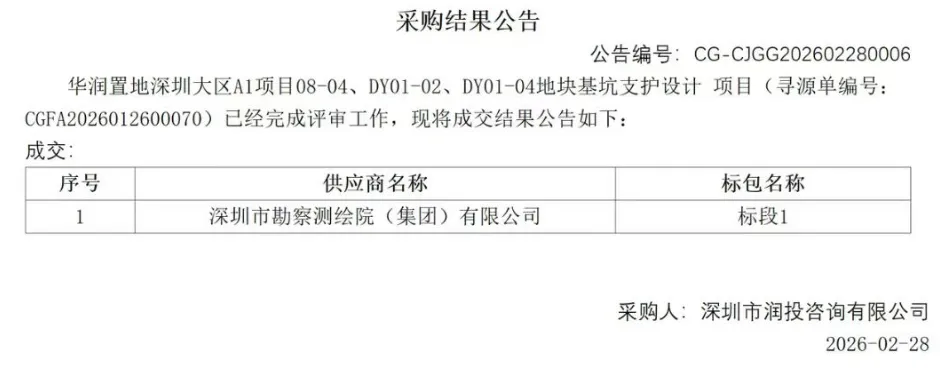 然后上个月,2026年2月28日,还是这家公司,又发布了一份《采购结果公告》,说针对“08-04、DY01-02、DY01-04”三个地块,华润已经找到了供应商来做基坑支护设计。这则公告,字数不多,信息量却巨大!