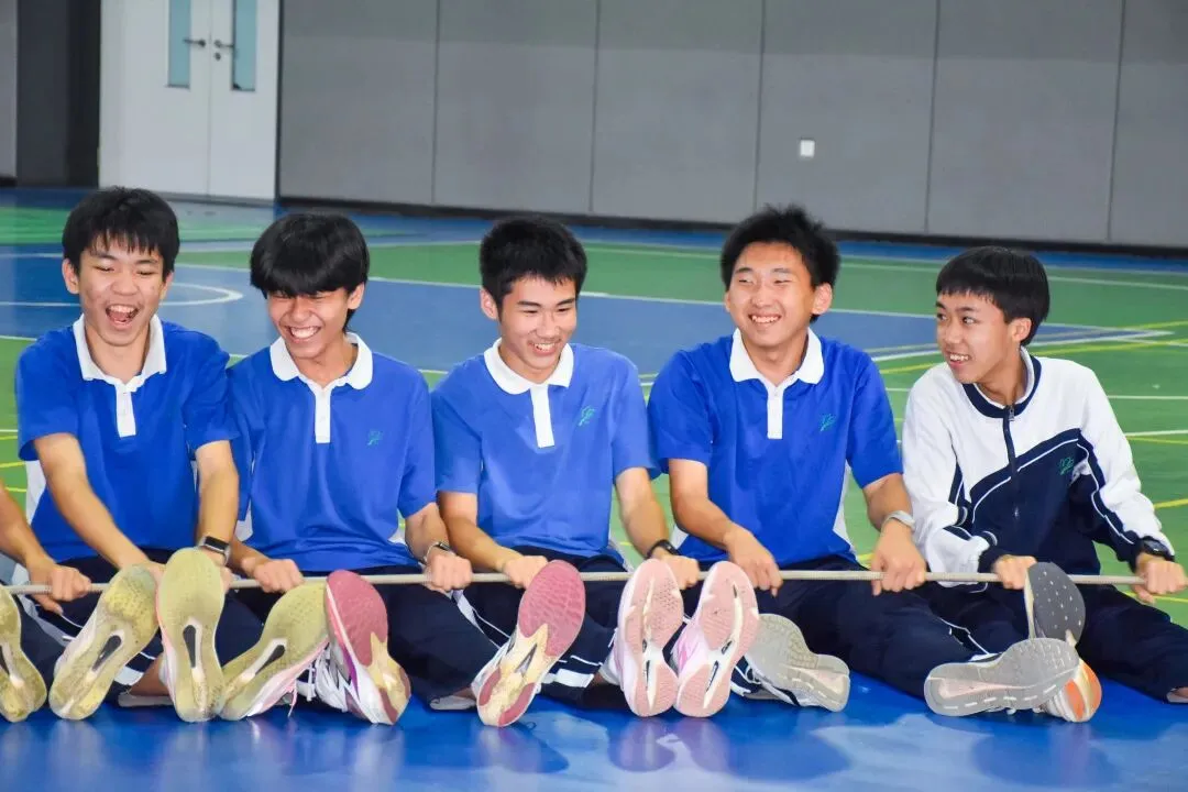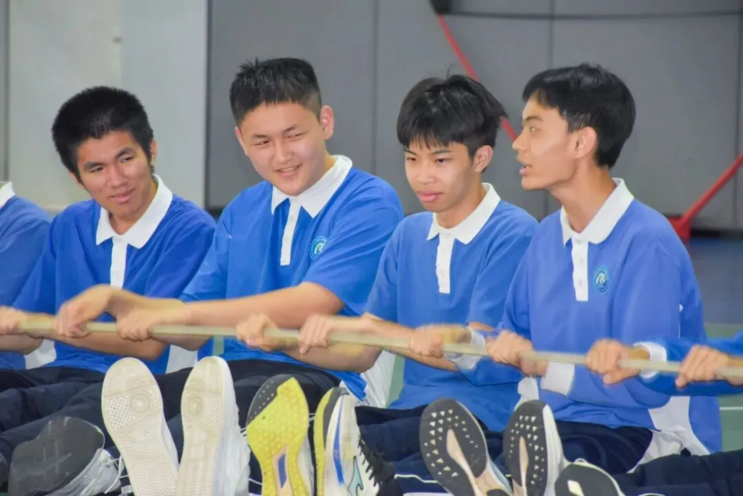同学围成一个巨大的同心圆,双手紧握绳索,在统一的口号声中,齐心协力将绳索拉紧、抬起、画圈。绳索在同学们的手中传递,仿佛一条流动的能量带,承载着信任与责任。当动力圈在大家的默契配合下形成整齐划一的波浪时,全场爆发出雷鸣般的掌声与欢呼声。这一刻,个人的力量融入集体的洪流,压力在团结协作中悄然消解,取而代之的是“我们在一起”的坚定信念。