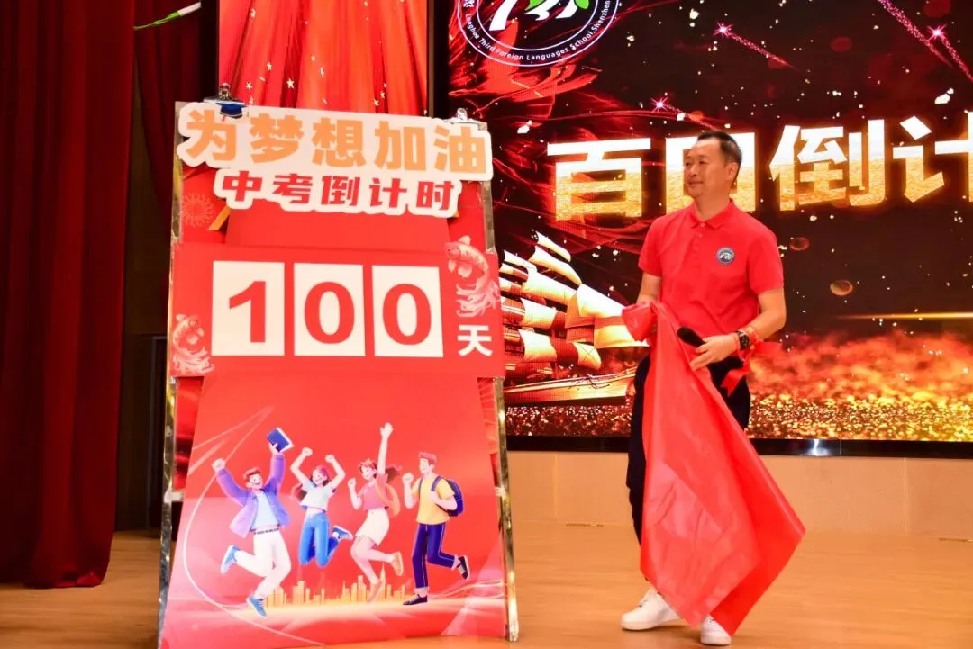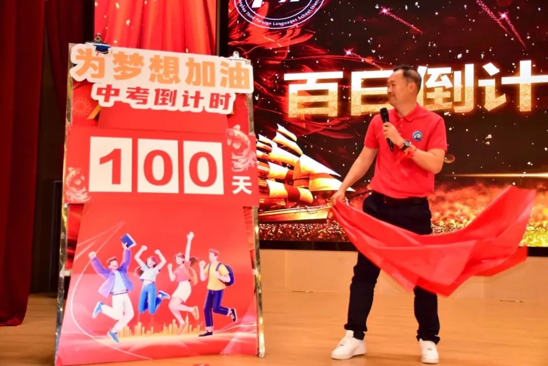 郭桂培副校长为“中考百日冲刺倒计时牌”揭牌。鲜红的数字“100”赫然醒目,提醒着每一位同学:时间紧迫,唯有拼搏!这一刻,大家的心中多了一份紧迫感,也多了一份使命感,百日冲刺的号角正式吹响。