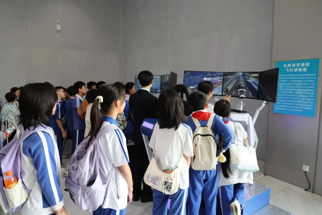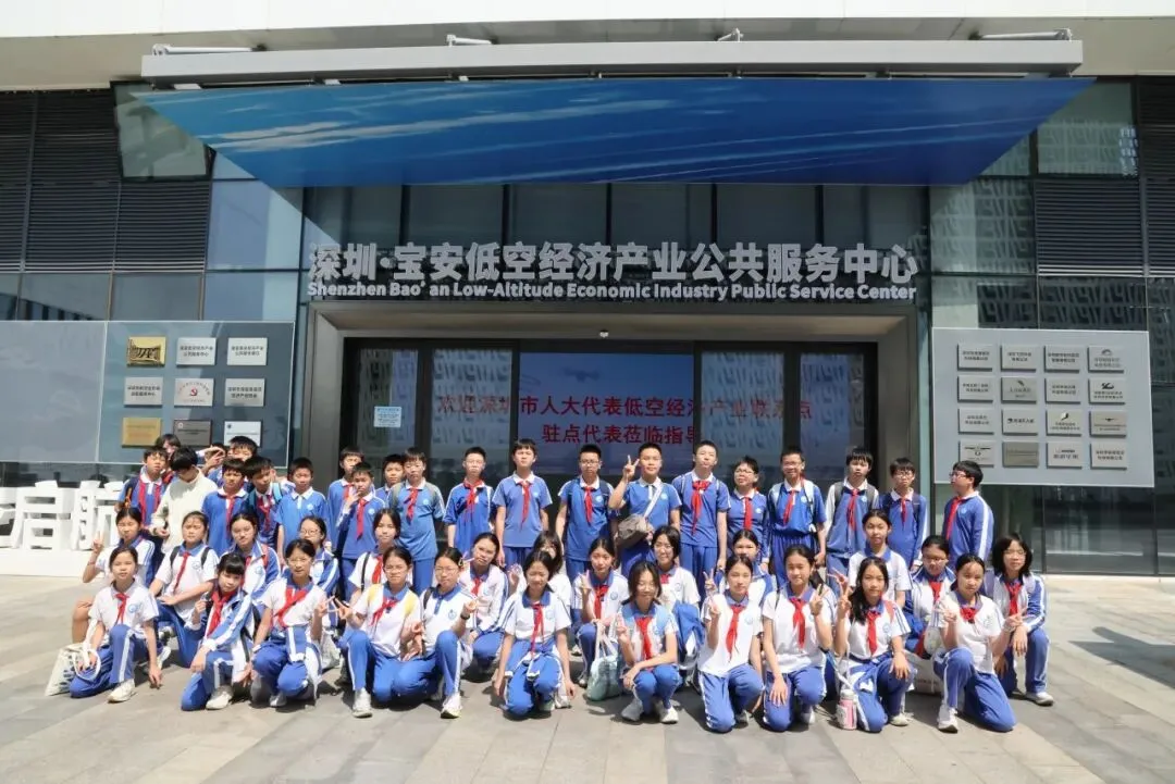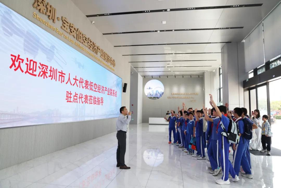 走出教室的第一站,同学们来到了充满未来感的宝安低空经济产业公共服务中心。在这里,书本上的国家战略化作了触手可及的生动场景。学生们不仅能够参观低空经济展厅,深入了解无人机和eVTOL(电动垂直起降飞行器)等前沿科技与应用场景,还能亲自上手体验飞行模拟器,试飞最新款无人机,直观感受低空飞行的魅力。零距离与科技的互动打破了传统课堂的边界,不仅是一次科技的启蒙,更是将抽象的爱国情感,具象化为对国家战略性新兴产业的深刻认知与自豪。