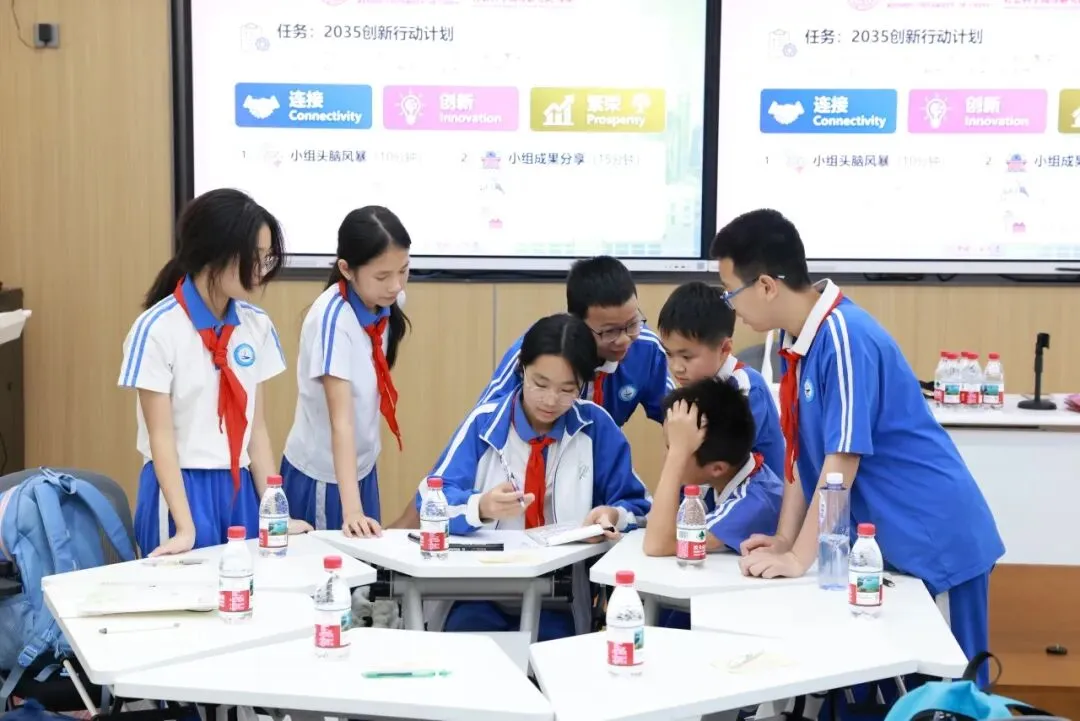 如何让新时代的青少年既能扎根中国大地,又能拥抱世界?作为本次合作课程的压轴环节,“先锋工作坊:我的2035创新行动计划”充分激发了学生们的自主思考能力。学子们展开热烈的分组讨论,结合APEC“连接、创新、繁荣”的国际议题,制定并分享小组的“未来先锋”行动计划。这一设计巧妙地将APEC议题自然融入课堂,引导学生们跳出单一视域,在复杂的全球化浪潮中锚定“全球坐标”,启发大家思考个人命运与世界发展的紧密联系。