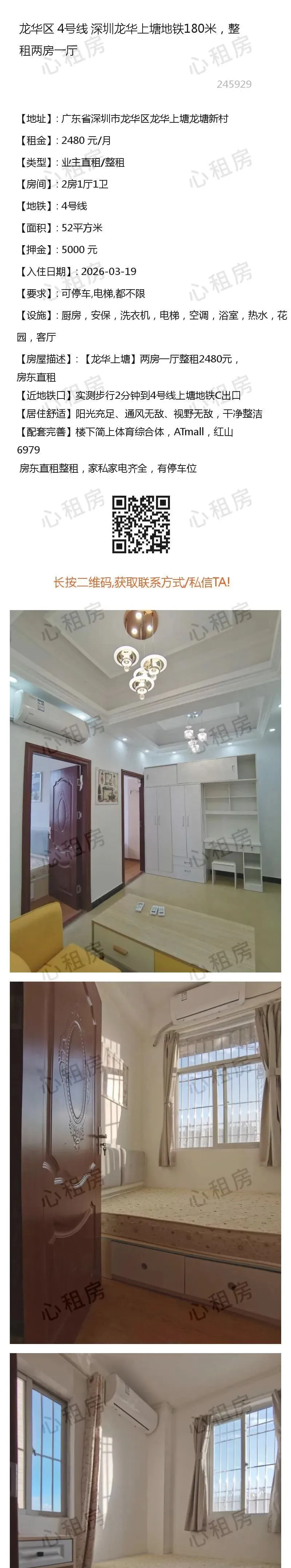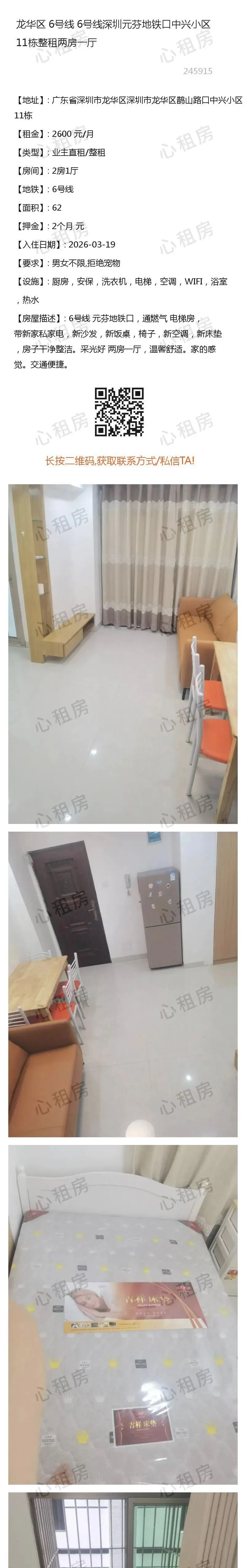 7、近期有人冒充我团线下工作人员,在此特别提醒:本公众号/心租房(homhere.cn)仅提供信息发布,不存在线下工作人员提供服务,请务必谨慎、切勿上当被骗。8、切勿轻信他人,点击他人提供的链接、二维码等,切勿按照他人指示提供验证码、进行转账等操作,谨防上当受骗。9、如遇提供虚假信息、冒充我团工作人员、引诱点击其他网站链接、实施诈骗等行为的,请及时在本公众号对话框里回复:Y,与我团客服联系。 查看不同房源→→深圳心租房公众号