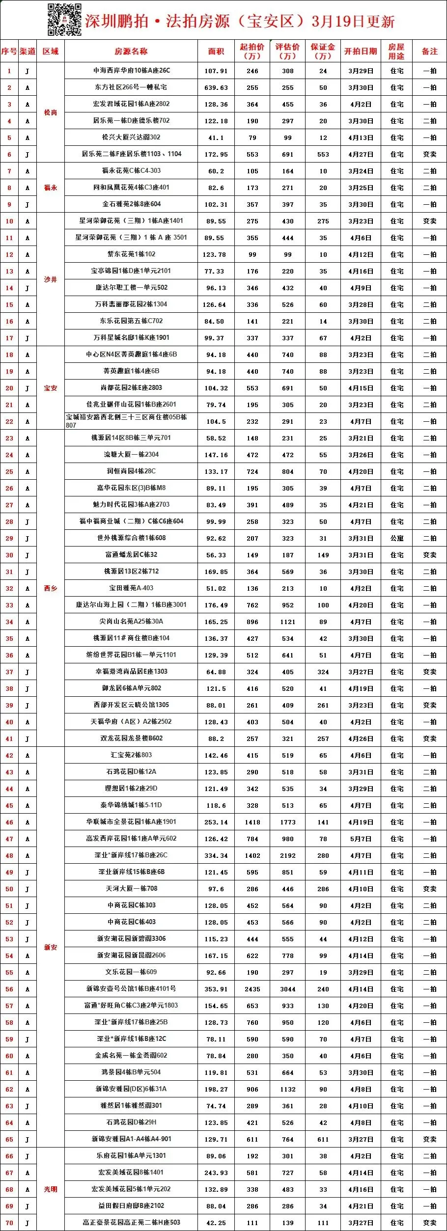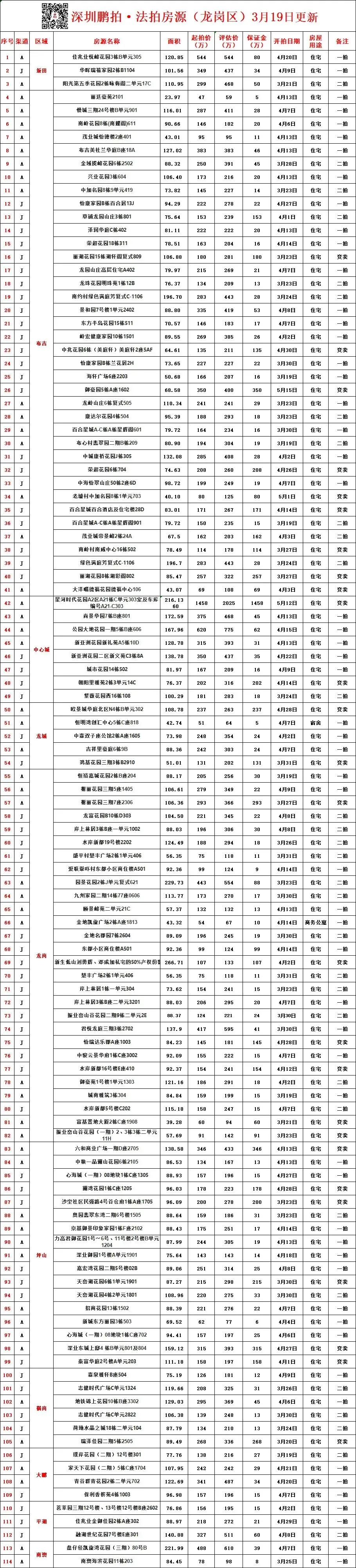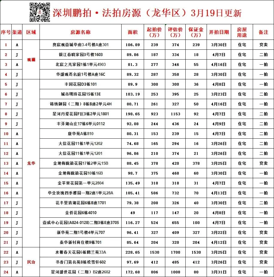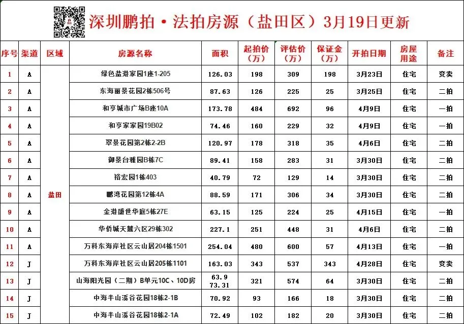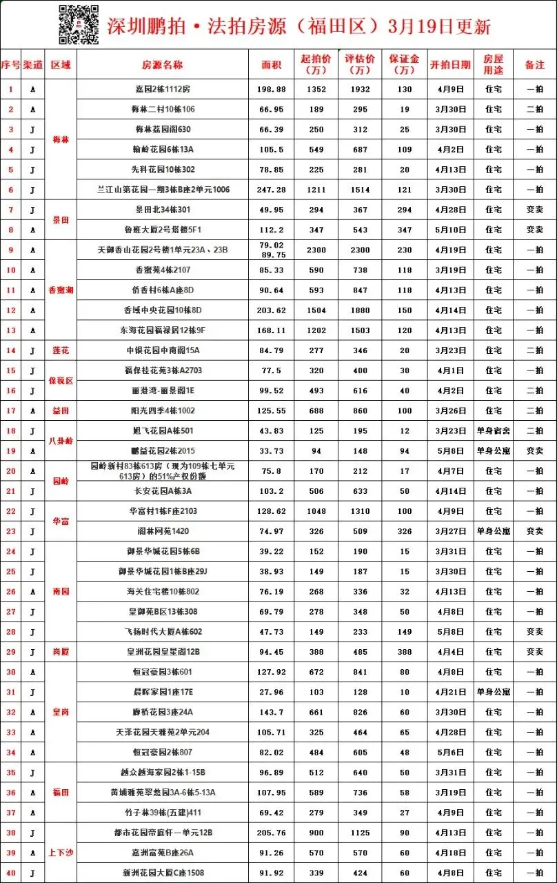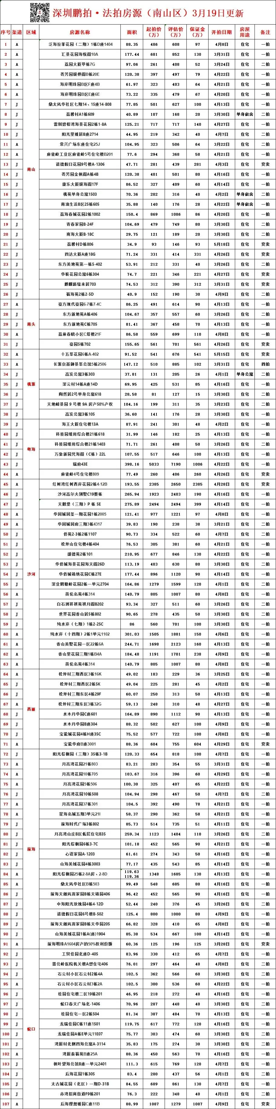 深圳各区所有法拍房源统计-3月19日