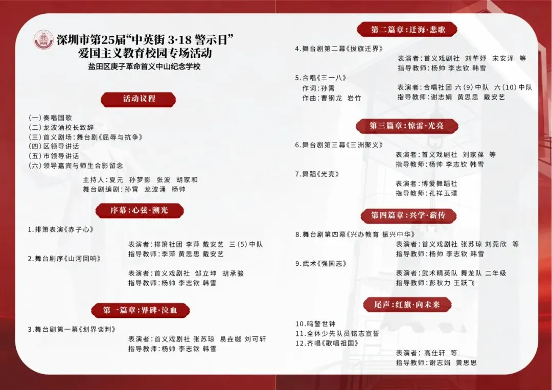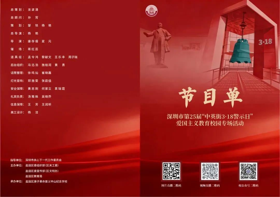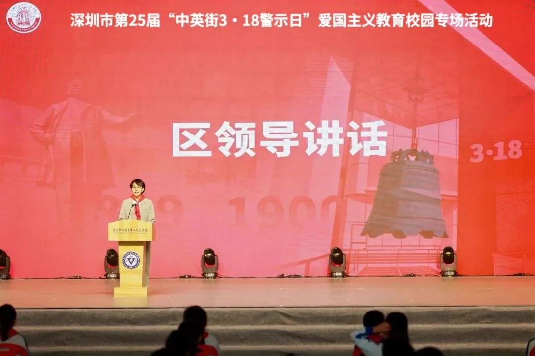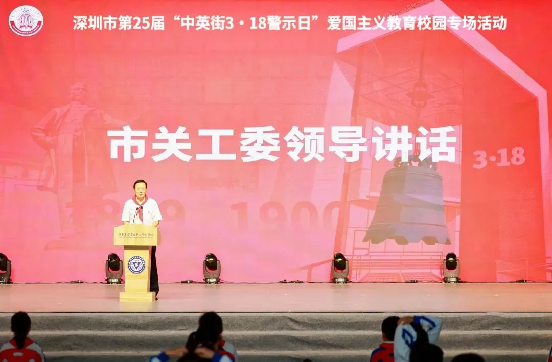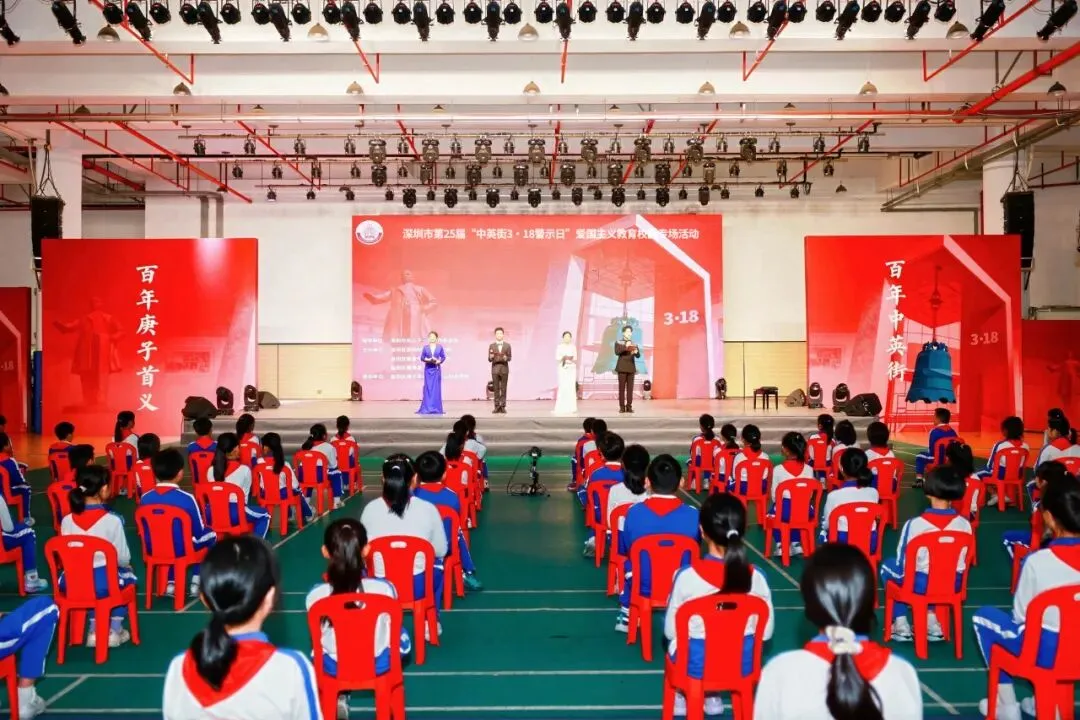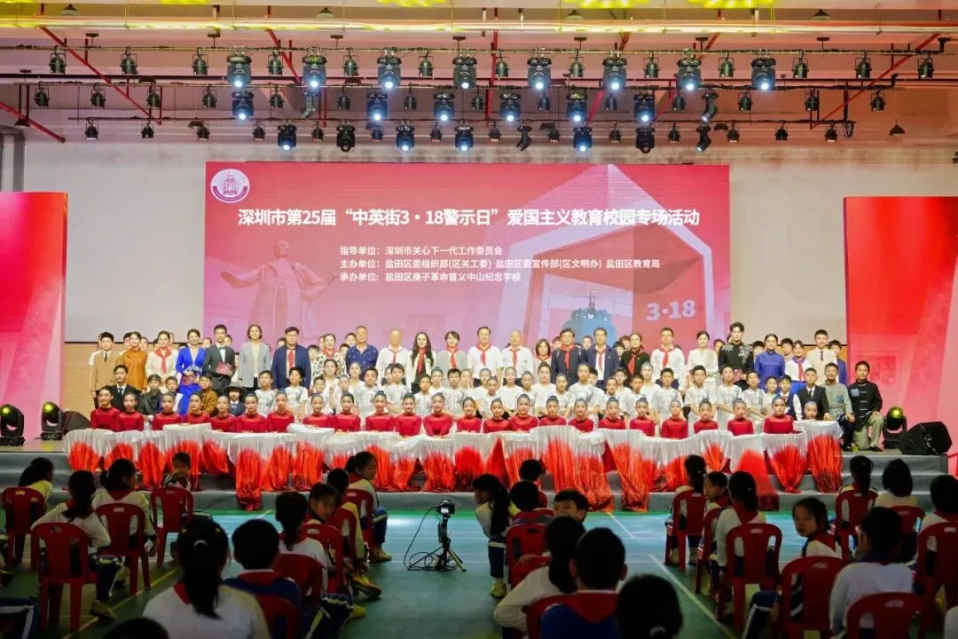 3月18日,深圳市第25届“中英街3·18警示日”爱国主义教育校园专场活动在盐田区庚子革命首义中山纪念学校举办。本次活动由深圳市关心下一代工作委员会指导,盐田区委组织部(区关工委)、区委宣传部(区文明办)、区教育局联合主办,融合课博会、沉浸式舞台剧等形式,带领师生、家长及嘉宾重温历史,厚植爱国情怀,凝聚强国建设的少年力量。