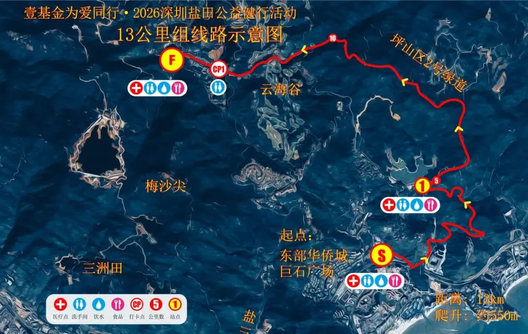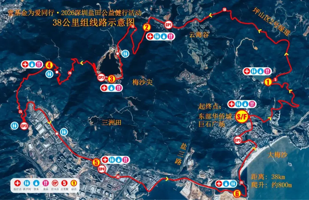 东部华侨城(起点)—坪山区2号绿道一茶溪谷一小三洲一谭仙庙一省立2号绿道一盐田河一海滨栈道一盐梅路一生物圈3号一环梅路一闲云路—东部华侨城(终点)