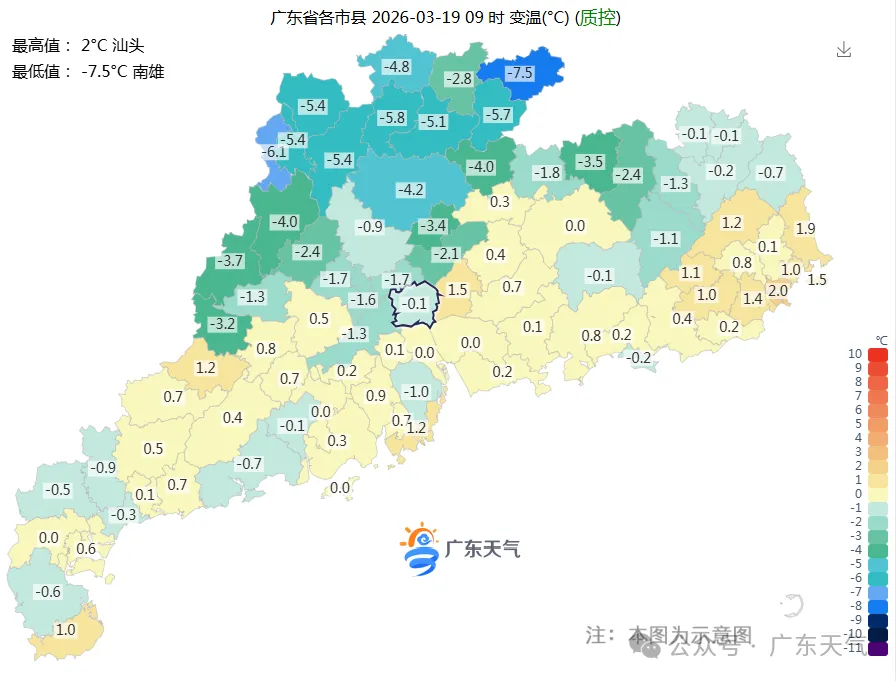 就在中南部努力“奔夏”的同时,粤西北的天气画风却截然不同。弱冷空气逐步逼近南岭,其锋面云系已于今天(19日)早晨影响粤北偏北地区,当地气温直接下降3-6℃。