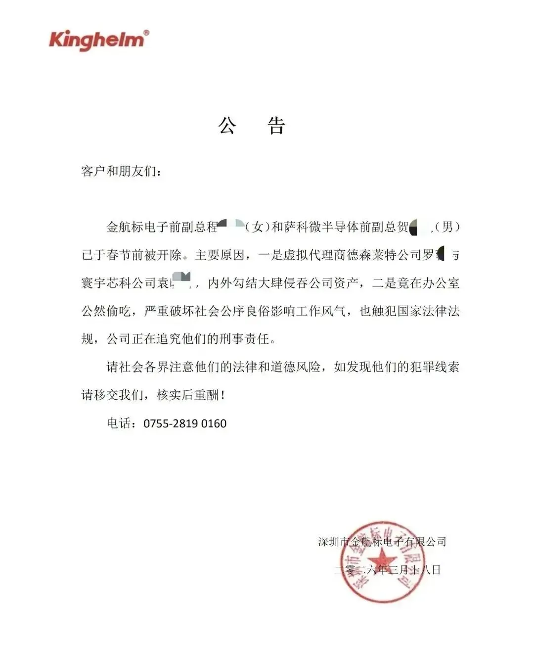 3月18日深圳金航标公告:两副总因在办公室偷吃,违反社会公序良俗。
