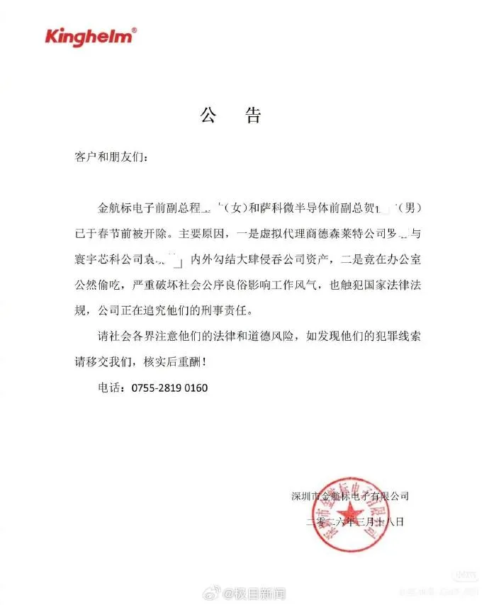 公告称,金航标电子前副总程某某(女)和萨科微半导体前副总贺某某(男)已于春节前被开除。主要原因,一是虚拟代理商德森莱特公司罗某与寰宇芯科公司袁某某,内外勾结大肆侵吞公司资产,二是竟在办公室公然偷吃,严重破坏社会公序良俗,影响工作风气,也触犯国家法律法规,公司正在追究他们的刑事责任。请社会各界注意他们的法律和道德风险,如发现他们的犯罪线索请移交我们,核实后重酬。公告落款为深圳金航标电子有限公司,并盖有公章。