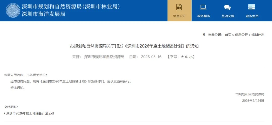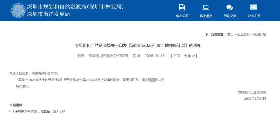 2026年3月16日,深圳市规划和自然资源局关于印发《深圳市2026年度土地整备计划》、《深圳市2026年度土地储备计划》两大计划的通知。