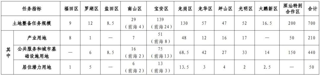 2026年度全市(含深汕特别合作区)土地整备完成用地不少于700公顷。其中,产业用地不少于210公顷、公共服务和城市基础设施用地不少于440公顷、居住潜力用地不少于50公顷。