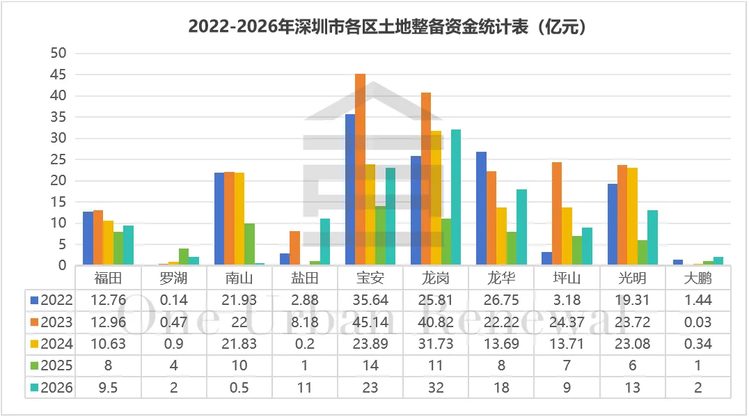 2026年度全市安排土地整备资金120亿元,同比上年增加71%。其中,龙岗土地整备资金增长最多,同比去年增加190%;其次是龙华,同比去年增加125%。
