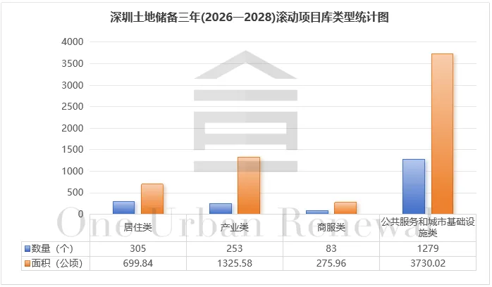 居住类土地储备项目115个,面积273.18公顷;产业类土地储备项目103个,面积476.63公顷;商服类土地储备项目22个,面积58.46公顷;公共服务和城市基础设施类土地储备项目530个,面积1263.32公顷。