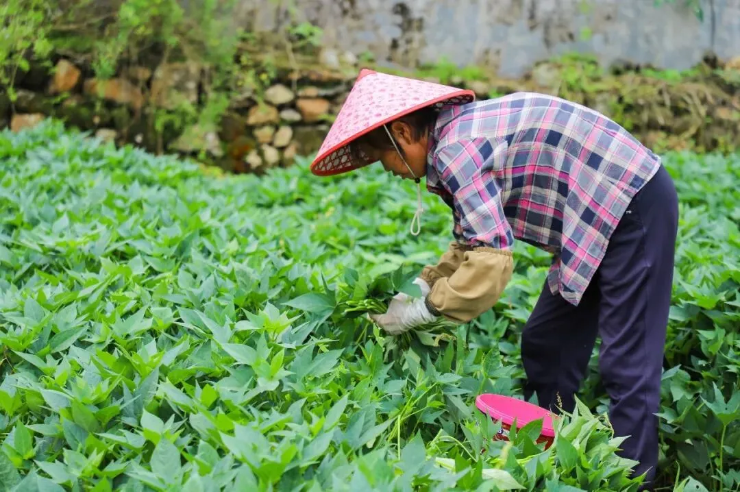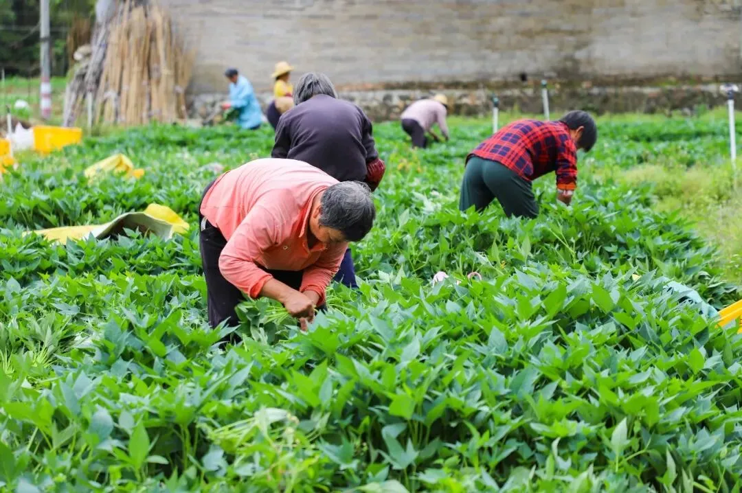 合禾蔬菜基地负责人陈文介绍,目前正值番薯叶采摘期。基地种植的番薯叶主打纯天然、无公害,主要销往深圳、香港等地区,市场反响很好。基地现有种植面积约350亩,采收期每天都有采摘任务。工人日均收入可达110至120元,带动了不少周边村民就业。