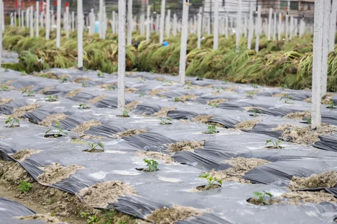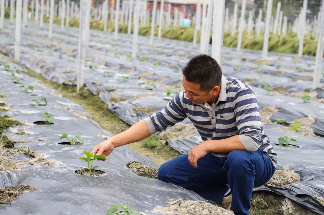 在基地的另一片田地,丝瓜、茄瓜、节瓜、南瓜等瓜苗刚刚栽种完毕,嫩绿的秧苗整齐排列。基地负责人正仔细查看成活情况和生长态势,精心做好管护工作,为接下来的丰产丰收打下基础。