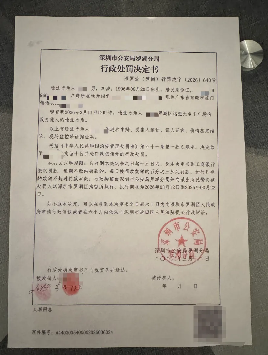 据铁铁提供的2份行政处罚决定书显示,涉嫌殴打他人和故意损毁他人财物的廖某和杨某均被深圳警方依法行政处罚,分别被处以行政拘留十日并处罚款伍佰元和行政拘留十日并处罚款贰仟元的行政处罚