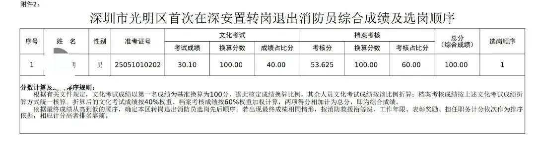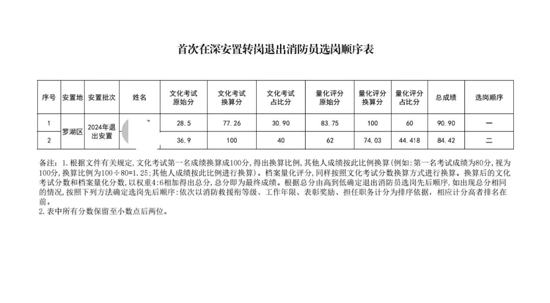 >【广东省深圳市宝安区、罗湖区、光明区】2026年度(2025年)退出消防员安排转岗安置岗位、量化评分公示