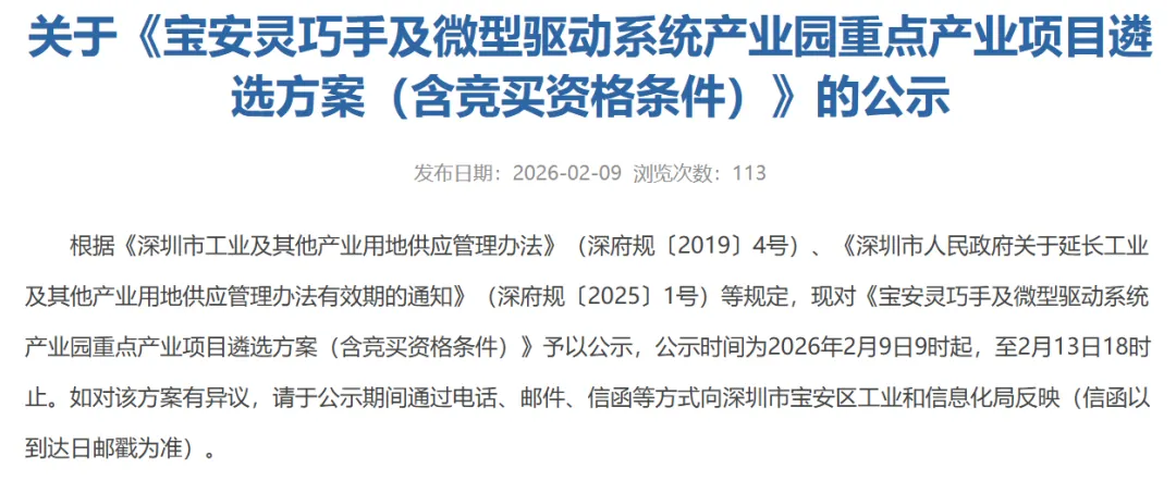 近日,据宝安区工信局公示信息显示:宝安灵巧手及微型驱动系统产业园重点产业项目遴选方案发布