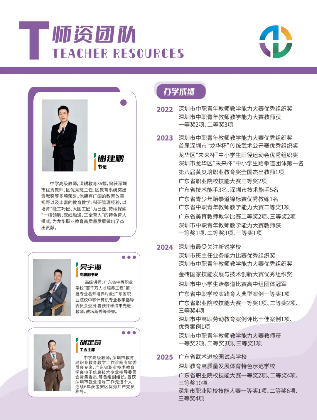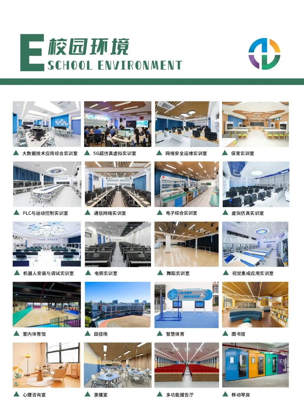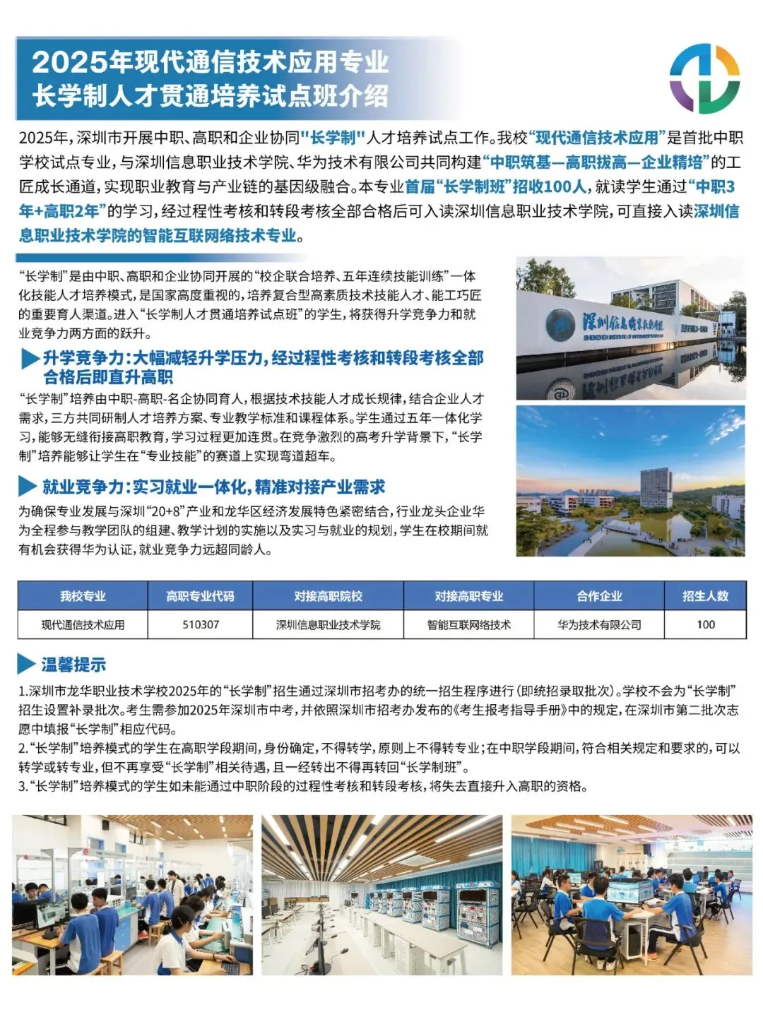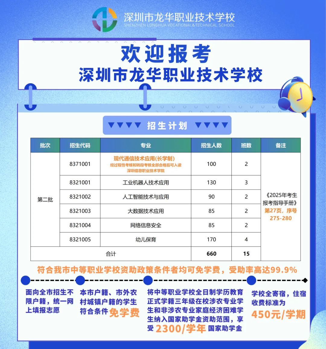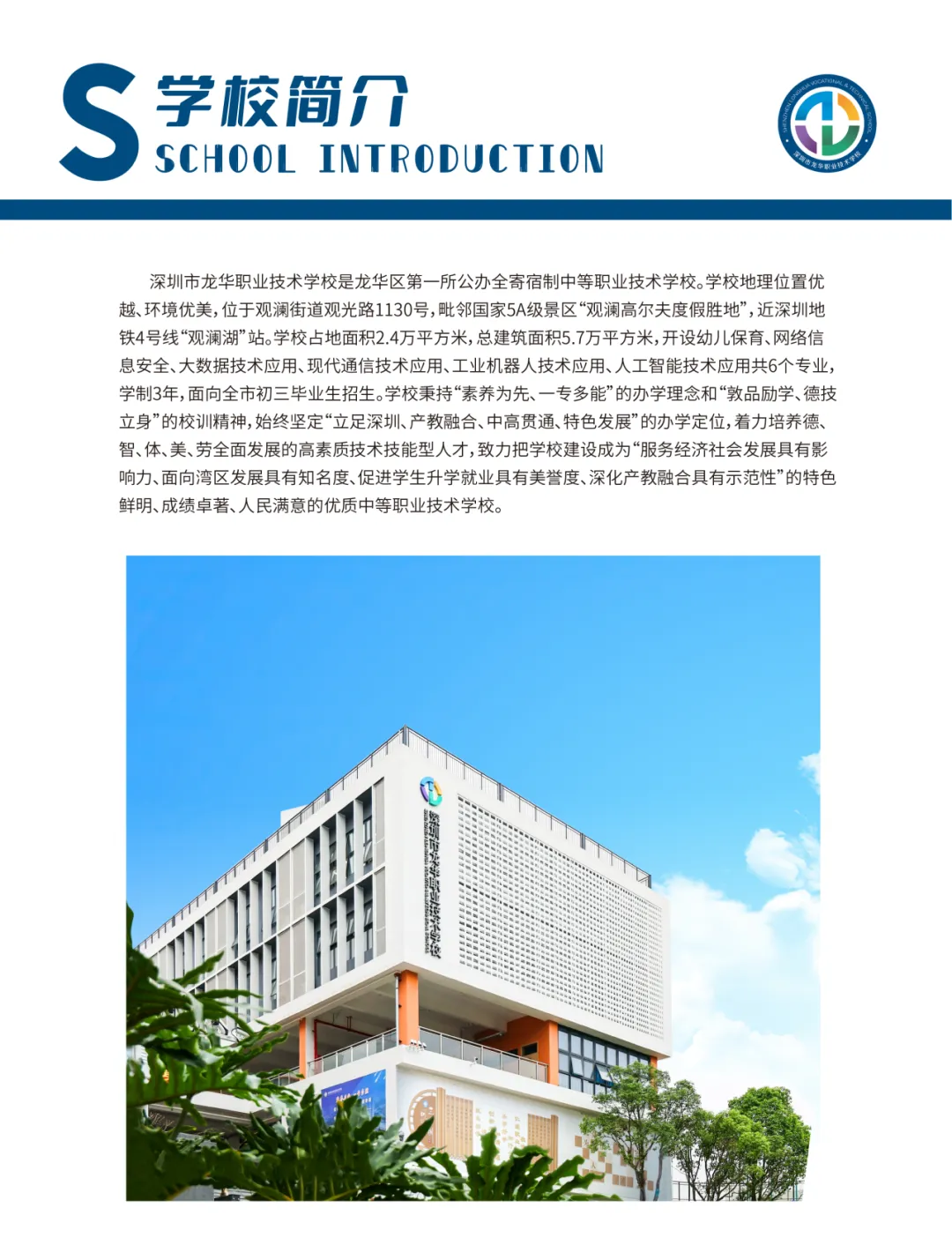 深圳市龙华职业技术学校 2022 年 9 月开办,是龙华区首所全日制公办全寄宿制中职校。学校占地 2.4 万平方米,总建筑面积 5.7 万平方米,40 个班可容纳 2000 名学生,学制 3 年,面向全市初三毕业生招生。学校秉持 “素养为先,一专多能” 理念,开设大数据技术应用、网络信息安全、现代通信技术应用、工业机器人技术应用、幼儿保育 5 大专业。师资队伍强大,还与华为等龙头企业合作,推进产教融合,助力学生升学与就业 。