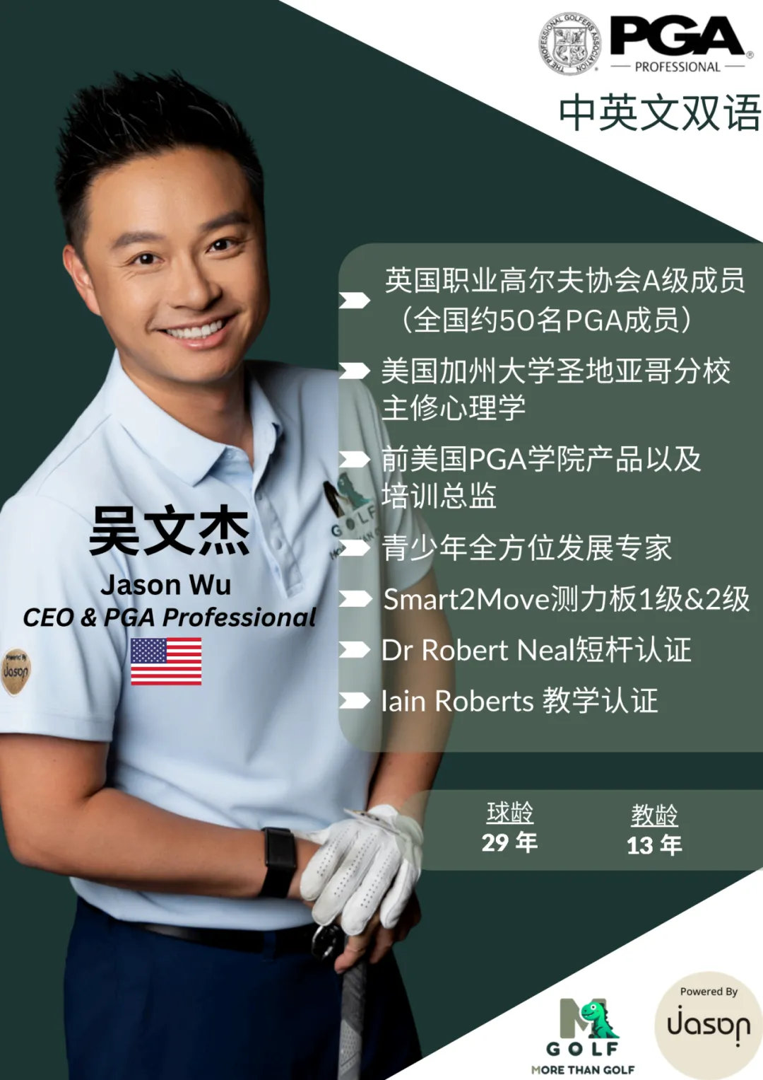 课程将由深圳MGolf 吴文杰(CEO & PGA Professional) 主讲,他是英国职业高尔夫协会A级成员,毕业于美国加州大学圣地亚哥分校心理学专业,曾任美国PGA学院产品及培训总监,专注青少年全方位发展。拥有 Dr Robert Neal 短杆认证及 Iain Roberts 教学认证,具备29年球龄与13年教学经验。