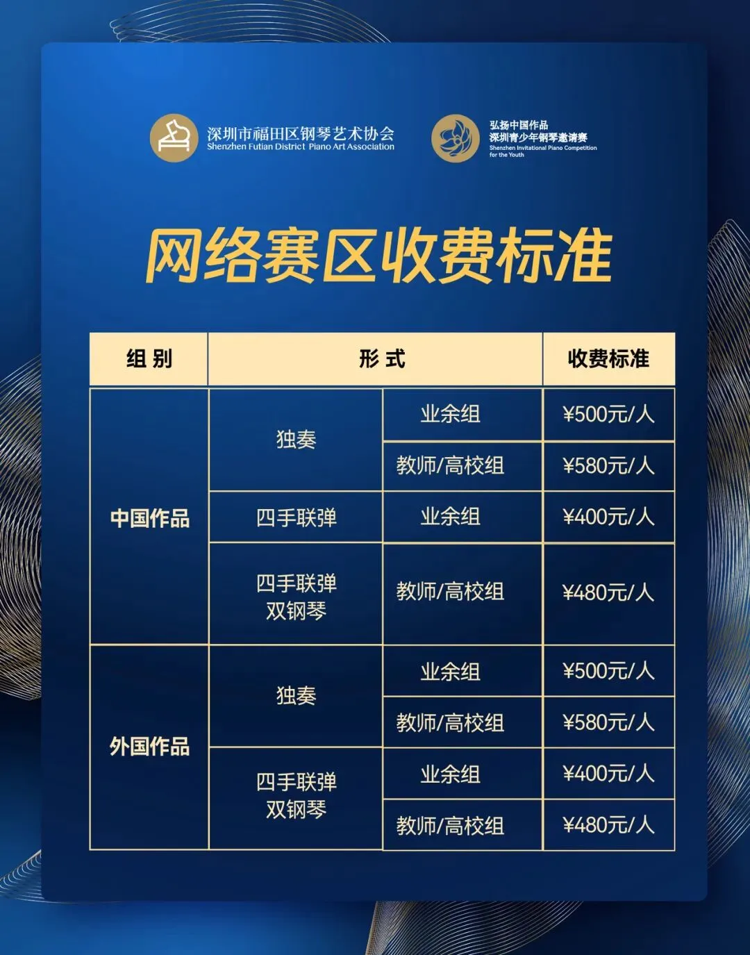 4、已开设分赛区线下比赛地区的的选手不可参加网络赛区的比赛(2026第四届深圳青少年钢琴邀请赛线下分赛区包括:广州赛区、天津赛区、西安赛区、江苏赛区、安徽赛区、海南赛区、广西赛区、武汉赛区、川渝赛区、山西赛区、粤西赛区、深圳赛区),一经发现违规报名,取消参赛资格/比赛成绩,报名费一概不予退回。