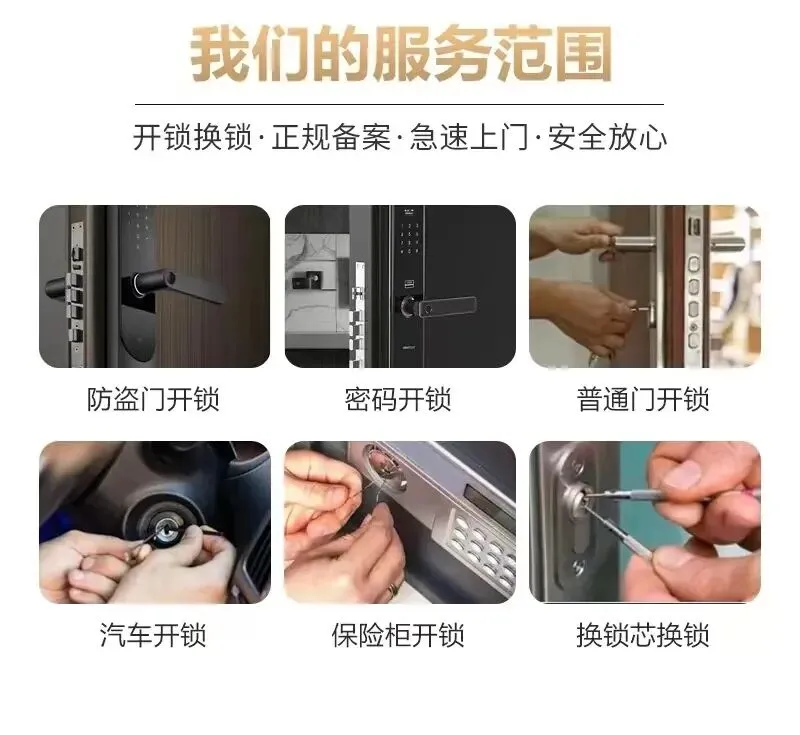 🛠️服务内容✅ 家用门锁开锁:防盗门、木门、铁门✅ 汽车开锁服务:各类车型紧急开锁✅ 指纹锁/智能锁安装与维修✅ 钥匙配制:机械钥匙、遥控钥匙✅ 锁芯更换、锁具升级与加固✅ 企业、办公室开锁及安全咨询