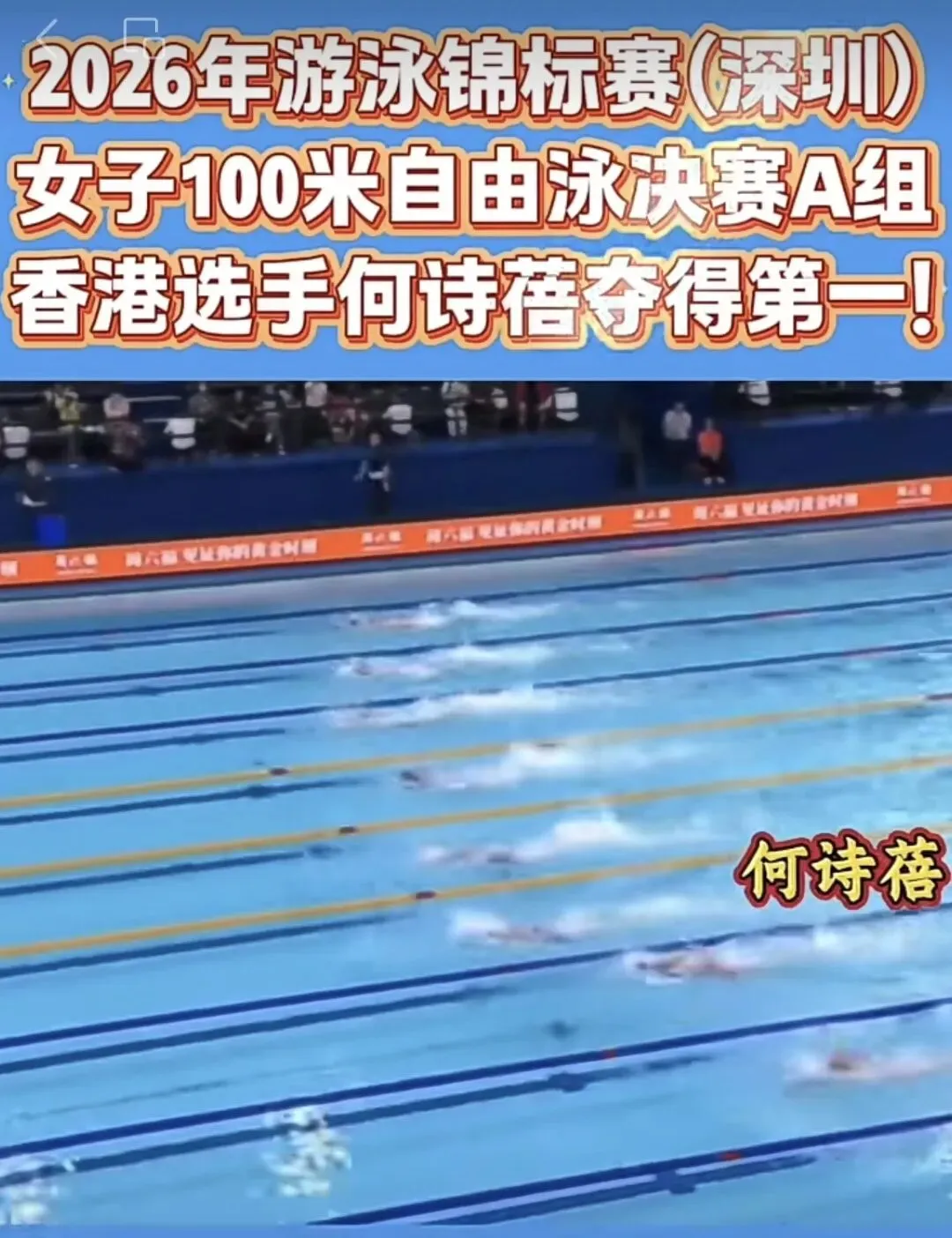 在女子100米自由泳决赛A组的较量中,中国香港选手何诗蓓展现超强实力,以52秒79的优异成绩强势夺冠,摘得金牌!