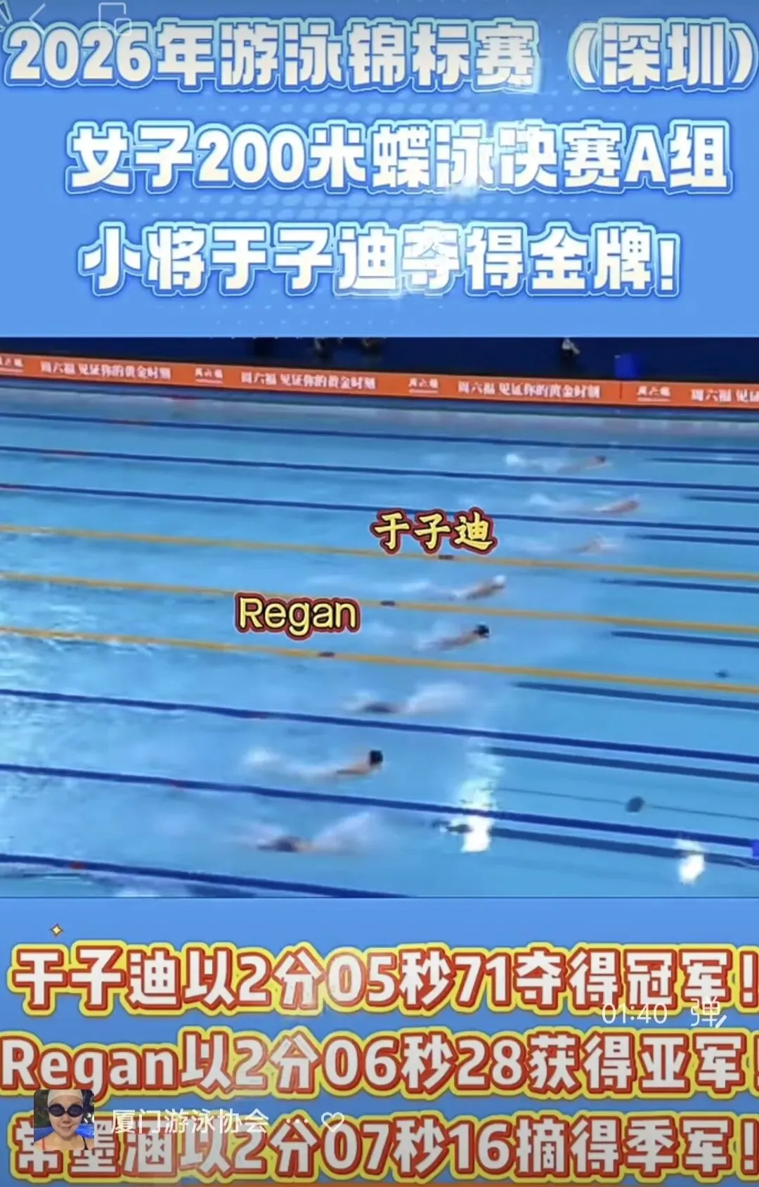 女子200米蝶泳决赛A组赛场,我国小将于子迪发挥稳定、节奏完美,以2分05秒71的出色成绩勇夺冠军,用实力诠释新生代泳将的风采!