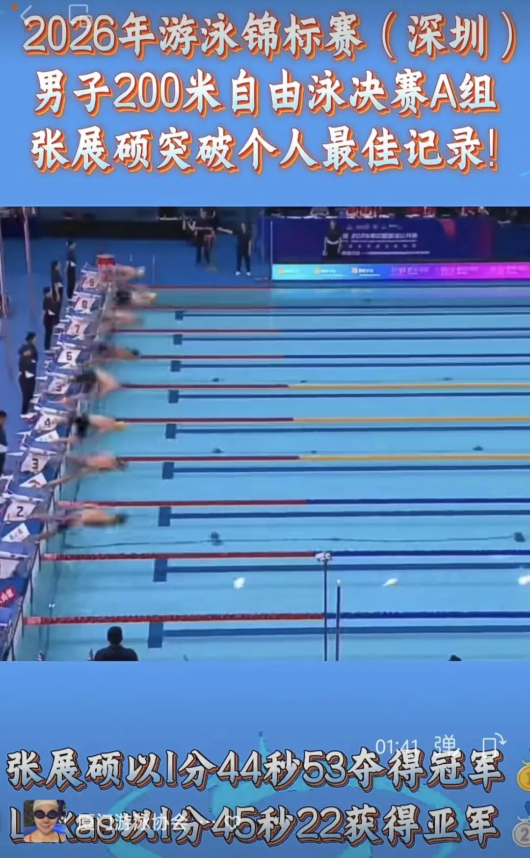 男子200米自由泳决赛迎来高光时刻,选手张展硕强势爆发、全程领跑,游出1分44秒53的惊人成绩,一举刷新个人最佳纪录,强势登顶夺冠!