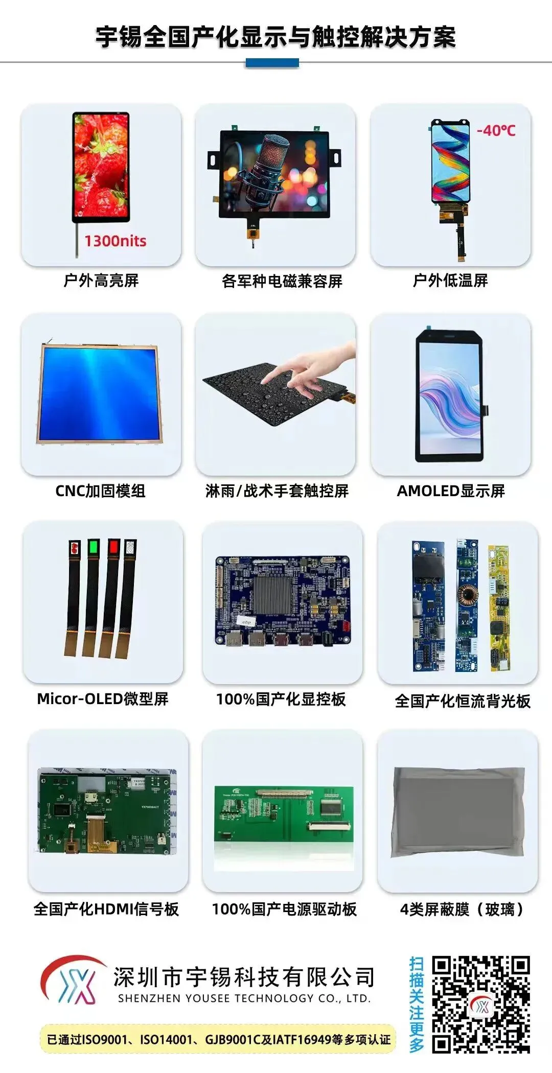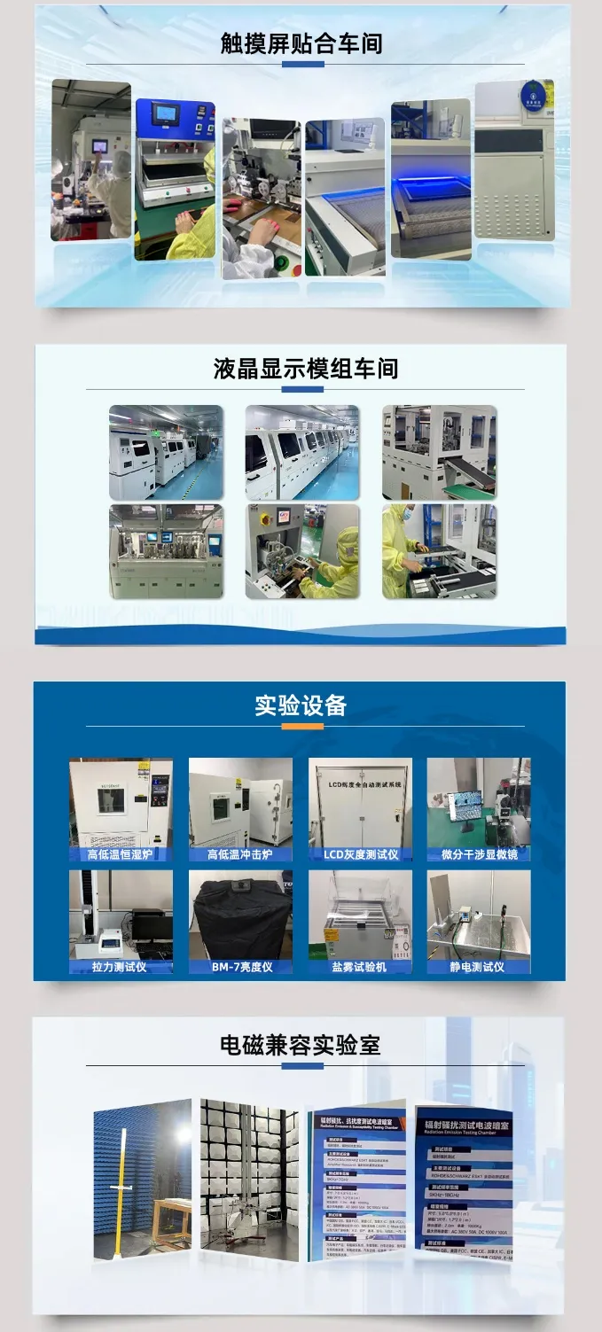 深圳宇锡科技有限公司配备国产屏模组工厂包括TFT&OLED,配备国产触摸工厂,配备水胶和OCA胶贴合厂,配备国产显控板事业部,配备CNC全加固工厂,配备4种技术路线的屏蔽膜(玻璃)事业部,配备电磁兼容实验室。