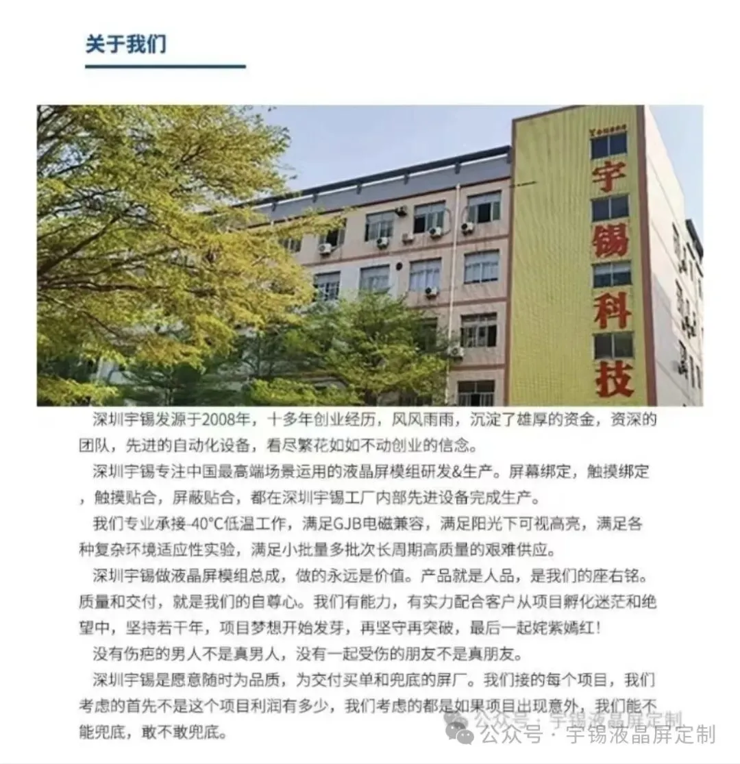 今天的文章我们不分享技术,分享点对读者朋友们可能会更有用的资源。隆重向读者朋友推荐一家成立18年以来,一直深耕于集TFT-LCD液晶显示模组研发、生产、销售和服务为一体的深圳本土化的国家高新技术企业——深圳宇锡科技有限公司。深圳宇锡科技有限公司星星之火发源于2008年,一直专注研发、研发和销售液晶显示屏。公司的发展主要分为两个阶段: