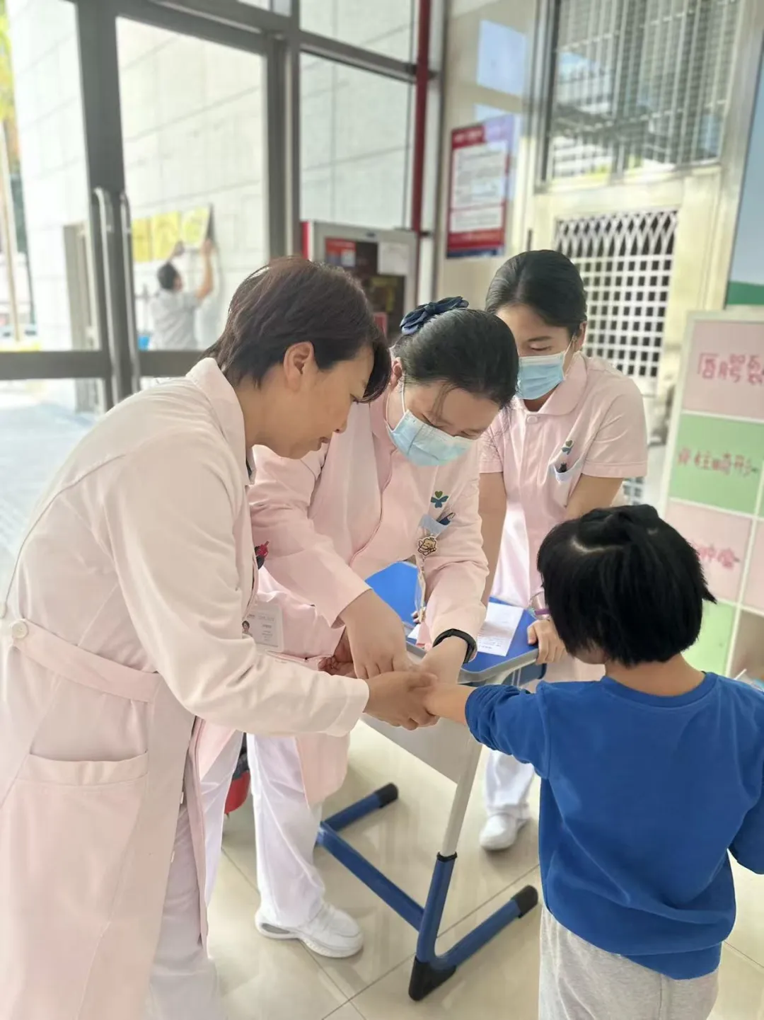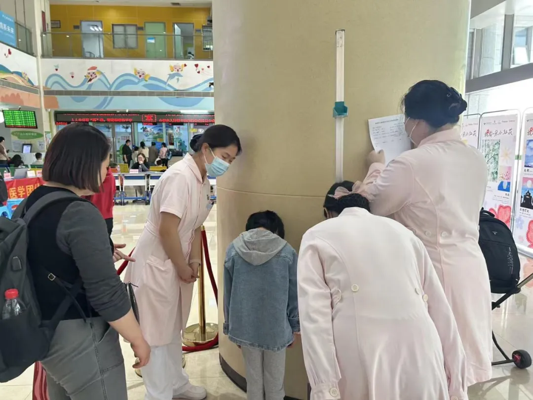 现场还设置了免费的基础检查区和签到咨询台,志愿者们引导患儿家庭有序完成签到、领取健康档案并进行初步的发育评估。