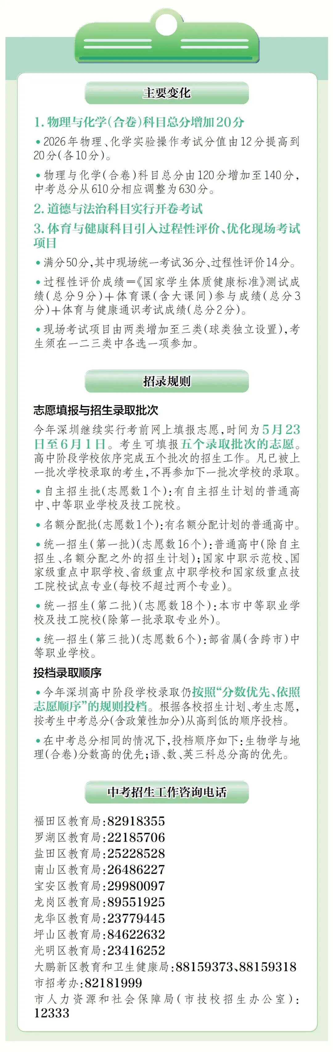 近日,深圳市教育局印发《关于做好2026年高中阶段学校考试招生工作的通知》。与往年相比,今年中考招生在报名条件、志愿填报、考试科目、录取规则等方面均保持不变。