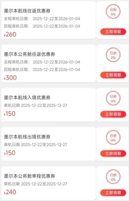 3.往返优惠券适用航班日期:2025年12月22日-2026年1月4日(具体航线适用日期请以实际查询为准)。