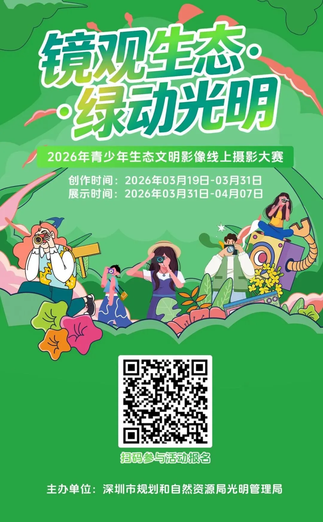 在国际森林日、全国爱鸟周相继来临之际,由深圳市规划和自然资源局光明管理局主办的“镜观生态·绿动光明”——2026年青少年生态文明影像摄影征集活动启幕。我们邀请全市中小学生,以镜头为媒,记录光明区的生态之美,讲述孩子们眼中关于森林、湿地与万物共生的故事,让生态文明理念在童心中生根发芽。
