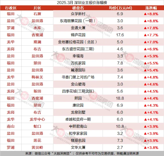 涨幅榜方面,3月业主报价涨幅区间为3.8%-8.8%。榜首双雄——福田石厦片区的众孚新村与盐田港片区的东海丽景花园(一期),均以8.8%的涨幅并列第一。福田区成为最大赢家,共有6个小区上榜,盐田区则以5个居次席,两区在业主信心与价格回稳上表现亮眼。
